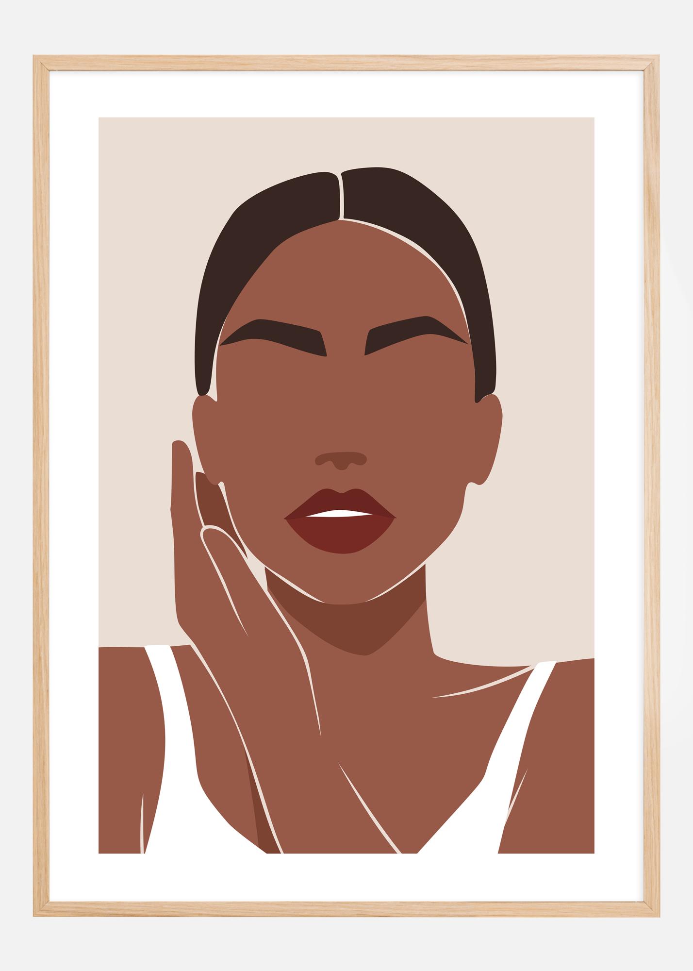 Denna estetiskt tilltalande poster avbildar en kvinnlig silhuett i en stiliserad och förenklad form. Bilden är uppbyggd med ett begränsat färgspektrum bestående av jordnära toner, från ljus beige till djupare brun, vilket ger en varm och välkomnande känsla. Kvinnans hållning är avslappnad och eftertänksam, vilket tillför en känsla av lugn och självsäkerhet till porträttet.