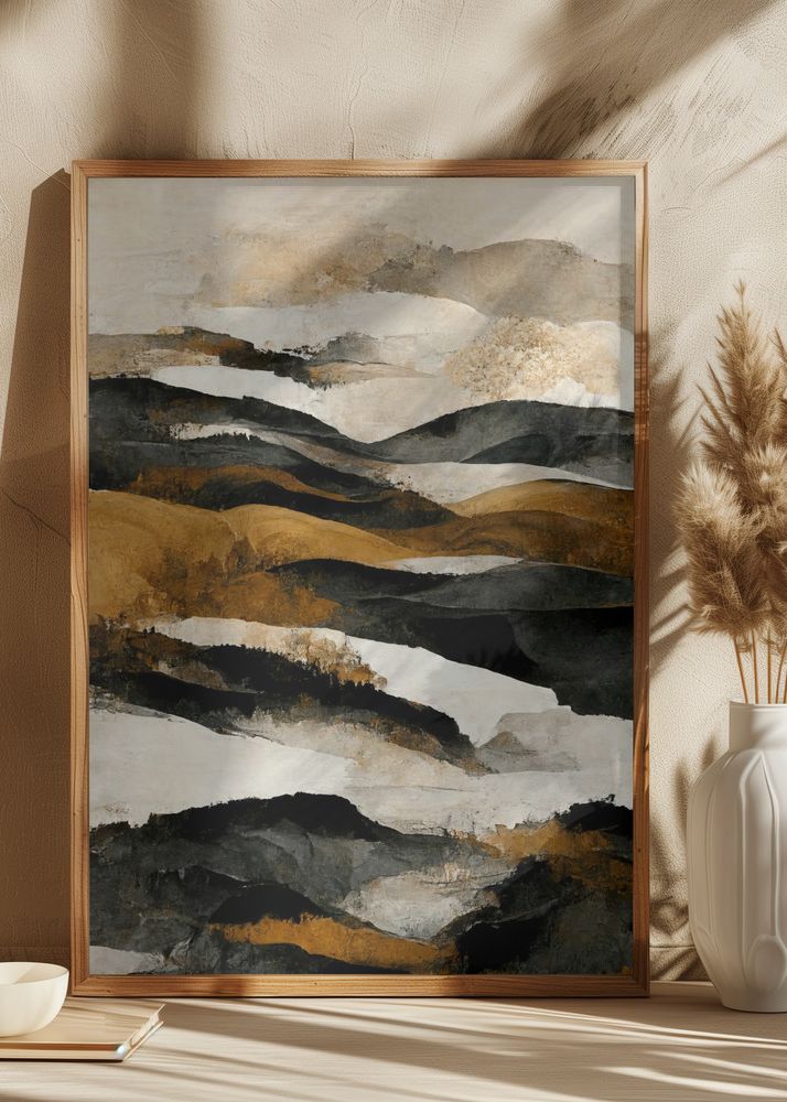 Denna poster erbjuder ett dramatiskt och stämningsfullt landskap med sina svepande linjer och skiktade strukturer. De varma tonerna av jordbrunt och ockra förenas med djupa nyanser av svart och grått, vilket skapar en känsla av både lugn och rörelse. Det konstnärliga uttrycket i denna affisch ger en modern och stilren touch till vilket rum som helst.
