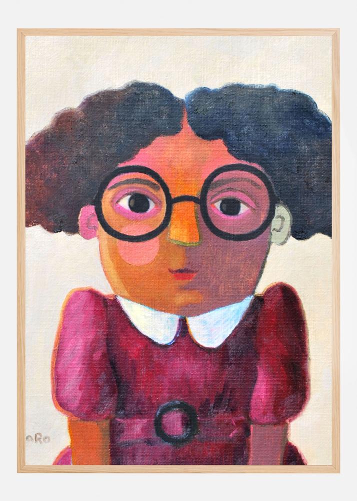 Denna färgstarka affisch fångar blicken med sitt unika och konstnärliga motiv. Postern visar en person med stort lockigt hår och runda glasögon, vilket ger ett självsäkert och tankfullt uttryck. Klädd i en röd klänning med vit krage, utstrålar bilden både lekfullhet och elegans. Motivets naiva konststil gör det till ett perfekt tillskott i både modern och retroinspirerad inredning.