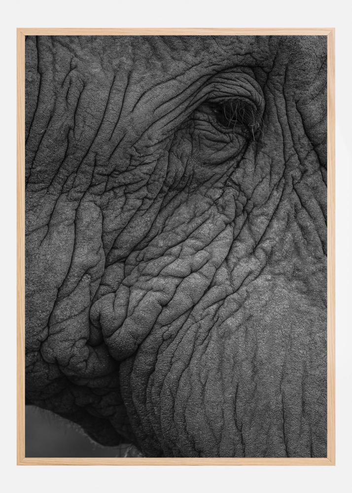 Denna poster fångar den imponerande närbilden av en elefant, där varje rynka och skiftning i huden framträder med en fantastisk detaljrikedom. Den svartvita färgskalan ger motivet en tidlös känsla och framhäver elefantens majestätiska uttryck. Perfekt som print i hemmet för att skapa en stark och stämningsfull atmosfär.