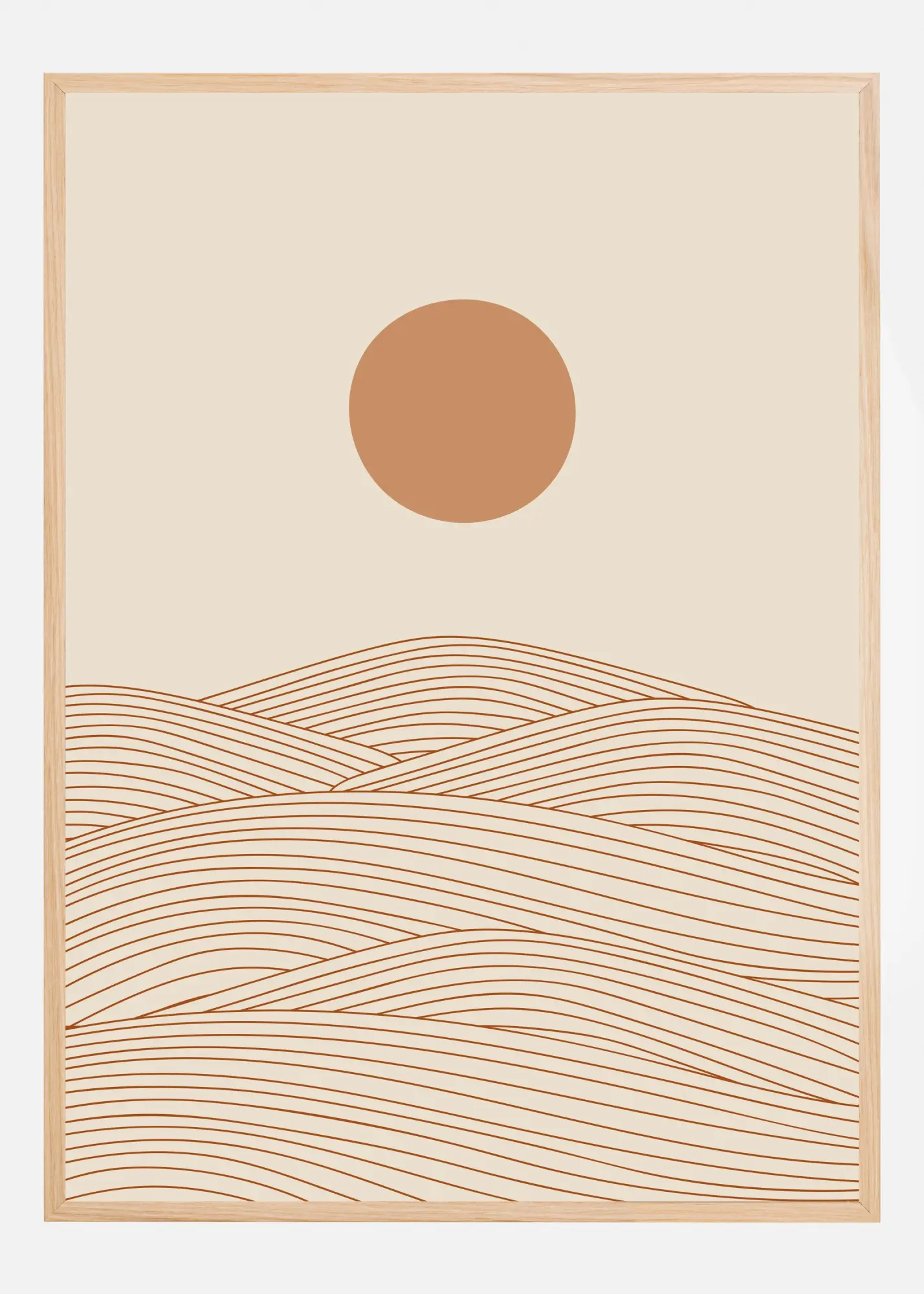 Denna stilrena poster erbjuder en minimalistisk design som framhäver naturliga element och lugna färger. Motivet består av böljande linjer som skapar en känsla av harmoni och rörelse. En enkel cirkel ovanför symboliserar solen och kompletterar landskapet. Denna affisch passar perfekt för den som söker ett konstverk som förmedlar lugn och balans i hemmet eller kontoret.