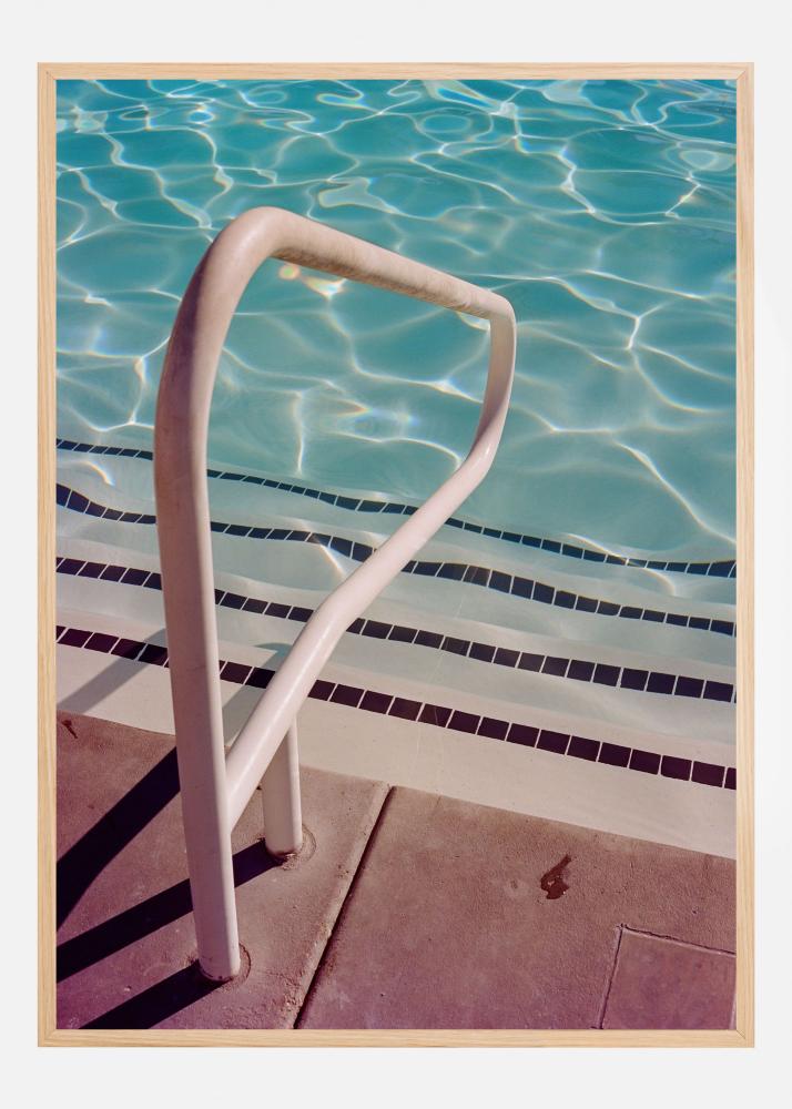 Denna stiliga poster fångar den fridfulla och soliga stämningen vid en poolkant. Med en fokus på det ljusblå vattnet och mjuka vågor återspeglas ett lugnt ögonblick av sommaren. Det vita poolräcket i förgrunden tillför en modern och ren känsla, och de subtila nyanserna i vattnet skapar en förtrollande visuell effekt.