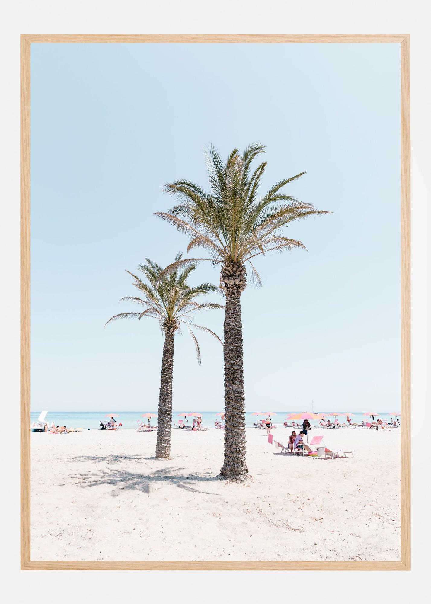 Denna poster fångar en somrig strandscen med två majestätiska palmer i förgrunden. Den ljusa, lugna himlen sträcker sig oändligt över horisonten och skapar en känsla av ro. Ett par solbadande människor och parasoller ger liv åt stranden och påminner om soliga semesterdagar. Det är en perfekt affisch för den som vill föra in en bit av sommarens värme i sitt hem eller kontor.