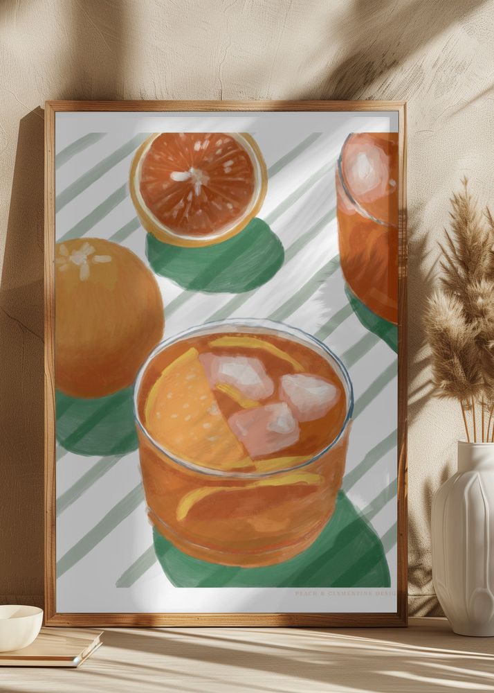 Denna poster fångar essensen av en uppfriskande drink med apelsinmotiv i centrum. Med saftiga apelsiner och en läcker drink på bilden ger denna affisch en känsla av sommar och fräschhet. Perfekt att hänga i köket eller vardagsrummet för att skapa en livlig och inbjudande atmosfär. Motivet betonar den enkla skönheten i citrusfrukter och inspirerar till fruktiga stunder.