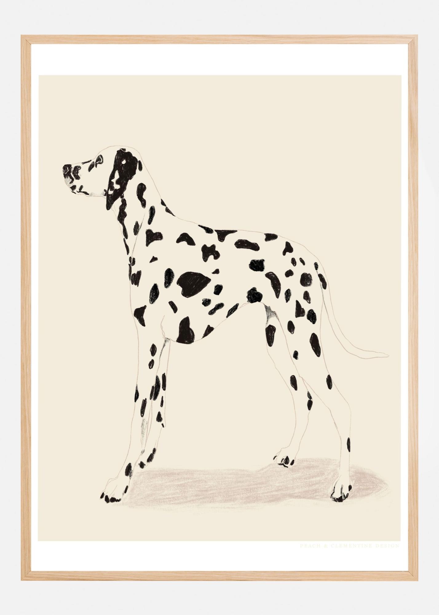 Denna stilrena poster fångar elegansen hos en dalmatiner med sina karakteristiska svarta prickar mot en ljus beige bakgrund. Det minimalistiska uttrycket gör att affischen enkelt kan passa in i olika inredningsstilar. Perfekt för djurälskare eller för den som vill ha en stilren och modern touch på väggarna.