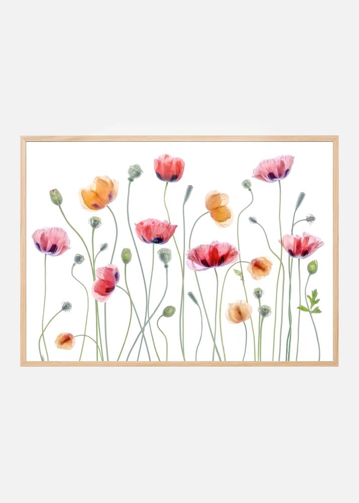 Den här vackra affischen illustrerar en samling blomstrande vallmoblommor som sträcker sig upp mot en ljus bakgrund. Blommornas skira kronblad är detaljrikt avbildade, vilket ger en känsla av rörelse och liv i bilden. Med sina levande och mjuka toner blir denna poster en elegant detalj i vilket hem som helst.