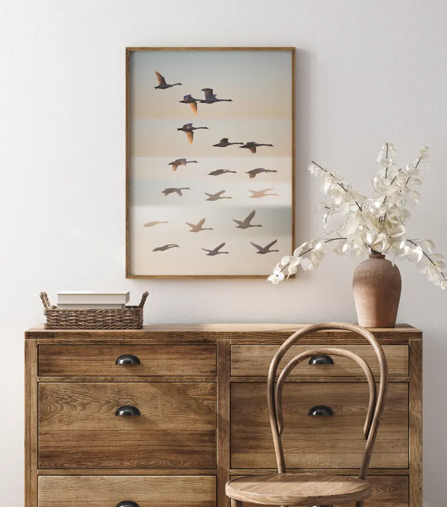 En vildmarksposter med en flock gäss som flyger högt i solnedgången. Den här målande bilden förmedlar en berättelse om migration, allt mot en bakgrund vackra blå och orangefärgade färger. Följ med på resan när du hänger upp den hemma.