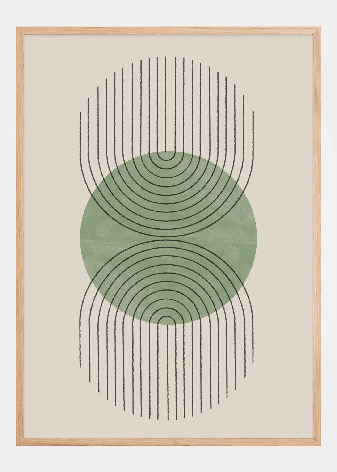 Denna poster är ett minimalistiskt konstverk som framhäver en mättad grön cirkulär form omgiven av en serie svarta linjer, vilket ger en känsla av rymd och djup. Den gröna nyansen i cirkeln varierar i intensitet, vilket skapar en visuell effekt av dimension och textur. Linjerna, som sträcker sig utåt från cirkelns kant, skapar en nästan hypnotisk effekt och föreställer en geometrisk harmoni.