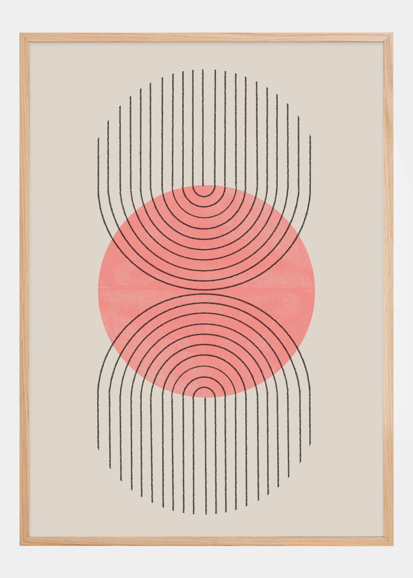 Denna samtida poster kombinerar enkelheten hos geometrisk form med en mjuk, tilldragande persikofärgad ton. En central cirkel med koncentriska ringar, som påminner om en lugn vattenyta, är omgiven av ett fält av vertikala svarta linjer som tycks pulsera utåt. Denna kontrast mellan den runda formen och de raka linjerna skapar en intressant dynamik och en känsla av rörelse i konstverket.