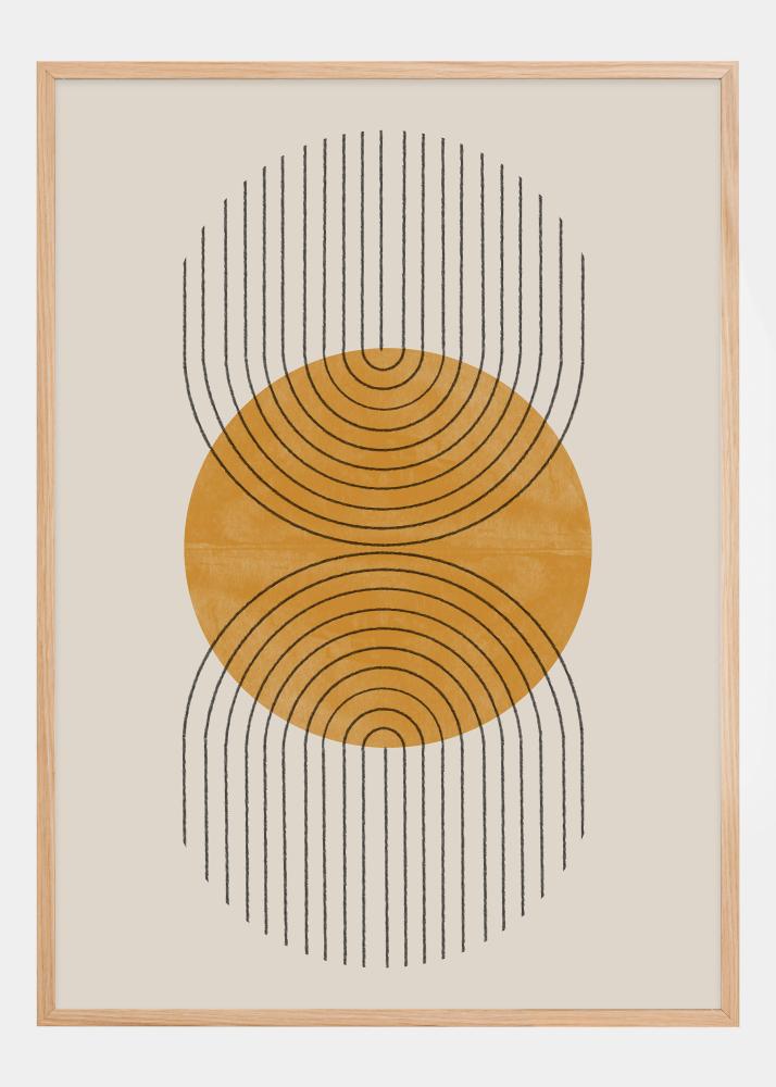Denna konstfulla poster presenterar en stark visuell komposition genom att placera en mättad, gyllene gul cirkelform i mitten omgiven av vertikala svarta linjer som skapar en optisk illusion av expansion och sammandragning. De koncentriska cirklarna inom den gula formen lägger till en känsla av djup och ger en organisk kvalitet till det annars strikt geometriska mönstret.