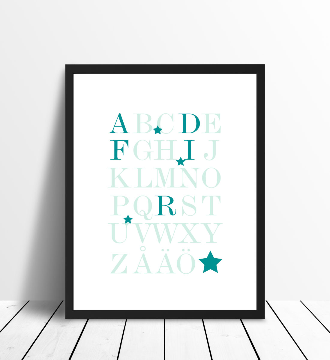 En modern plansch med alfabetstavla där bokstäverna i önskat namn sticker ut i en avvikande färg. Skriv enbart in namnet på din favoritperson och så skrivs affischen ut med de valda bokstäverna extra synliga i en härlig havsturkos färg. Välj vilken storlek du vill ha, skriv in namnet och skämma bort någon du håller kär med en personlig poster. Glöm inte att välja till en snygg ram!