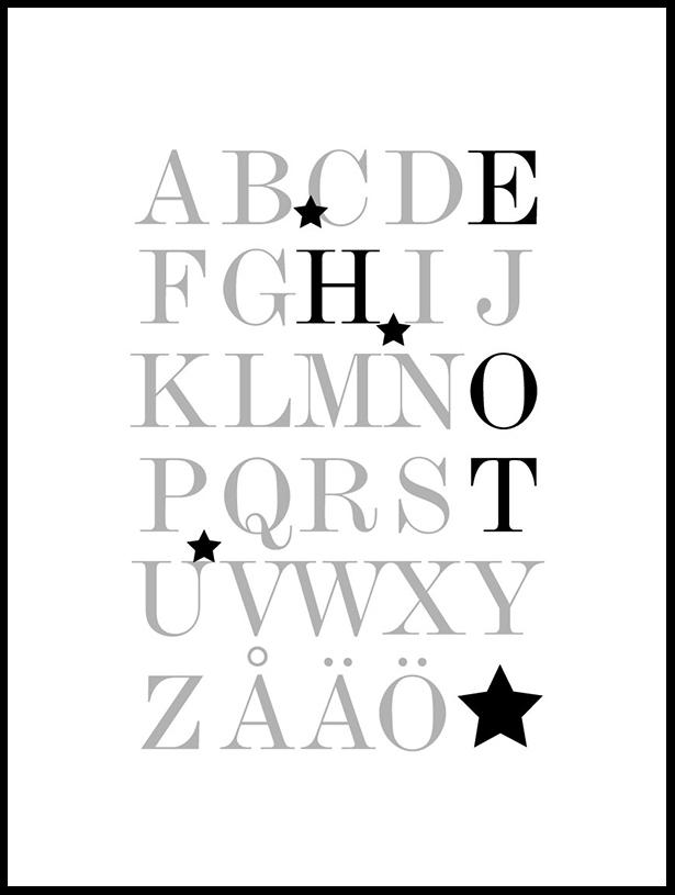 En modern plansch med alfabetstavla där bokstäverna i önskat namn sticker ut i en avvikande färg. Skriv enbart in namnet på din favoritperson och så skrivs affischen ut med de valda bokstäverna extra synliga i en stilren svart färg. Välj vilken storlek du vill ha, skriv in namnet och skämma bort någon du håller kär med en personlig poster. Glöm inte att välja till en snygg ram!