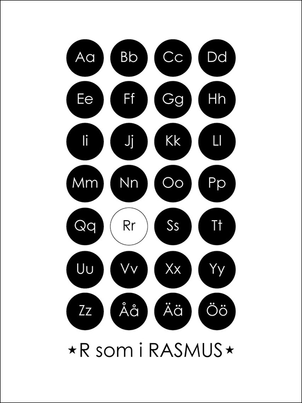 En modern plansch med alfabetstavla där barnets eller personens namn och första bokstav skrivs i avvikande färg. Skriv enbart in namnet på din favoritperson och så skrivs affischen ut med bokstaven i alfabetstavlan färglagd i vitt samt att namnet läggs till nedanför precis som på bilden med första bokstaven versal sen "som i" och sen namnet i versaler i svart färg.
