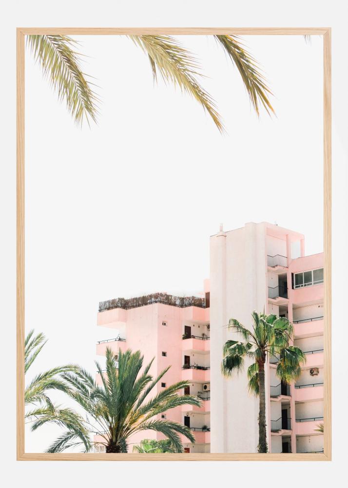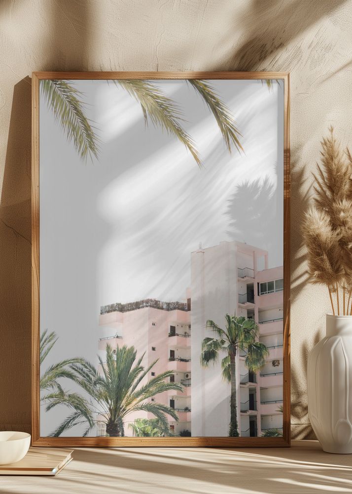 Färgpaletten i denna print består av mjuka toner i rosa, beige och grönt, vilket skapar en harmonisk och lugn känsla. De dämpade färgerna i motivet framhäver både de arkitektoniska linjerna i byggnaden och de frodiga detaljerna i palmbladen. Denna affisch är ett idealiskt val för den som vill föra in en känsla av sommar och natur i sitt vardagsrum, sovrum eller kontor.