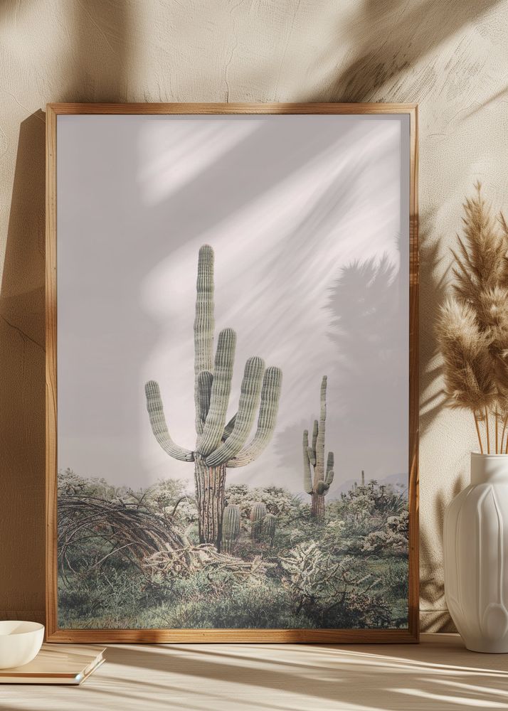 Denna poster fångar den tidlösa skönheten i en kaktusöken, där stora och majestätiska kaktusar sträcker sig mot himlen. Det natursköna motivet på denna print skapar en känsla av ro och äventyr, perfekt för att förvandla vilket rum som helst till en oas av lugn. Bilden ger en verklighetstrogen återgivning av dessa magnifika växter, med en komposition som bjuder in till drömmar om ökenlandskapets magi.