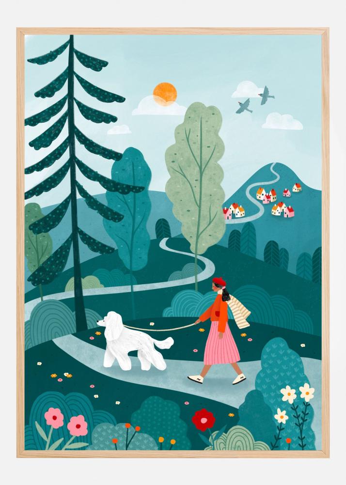 Denna charmiga poster fångar en fridfull landskapsscen med en kvinna som promenerar med sin hund. Motivet utstrålar en känsla av ro och naturens lugn, vilket gör det till ett perfekt tillskott i hemmet för den som vill ha lite naturkänsla inomhus. De diskreta men ändå uttrycksfulla detaljerna bidrar till en harmonisk atmosfär, och det vackra landskapet i bakgrunden vägleder betraktarens blick mot horisonten.