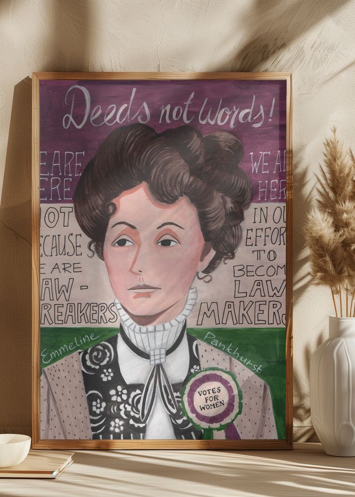 Denna skimrande poster porträtterar en ikonisk personlighet med stil och elegans, mot en bakgrund av inspirerande slagord som "Deeds not Words" och "Votes for Women". Motivet fångar en tid med kamp för rättvisa och jämställdhet och är inte bara en vacker dekoration utan också en påminnelse om viktiga historiska rörelser. Den målade stilen ger affischen en unik touch som enkelt drar blickarna till sig inom vilket rum som helst.
