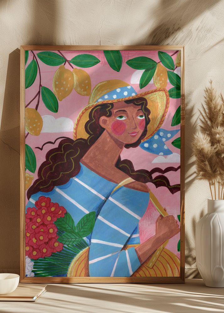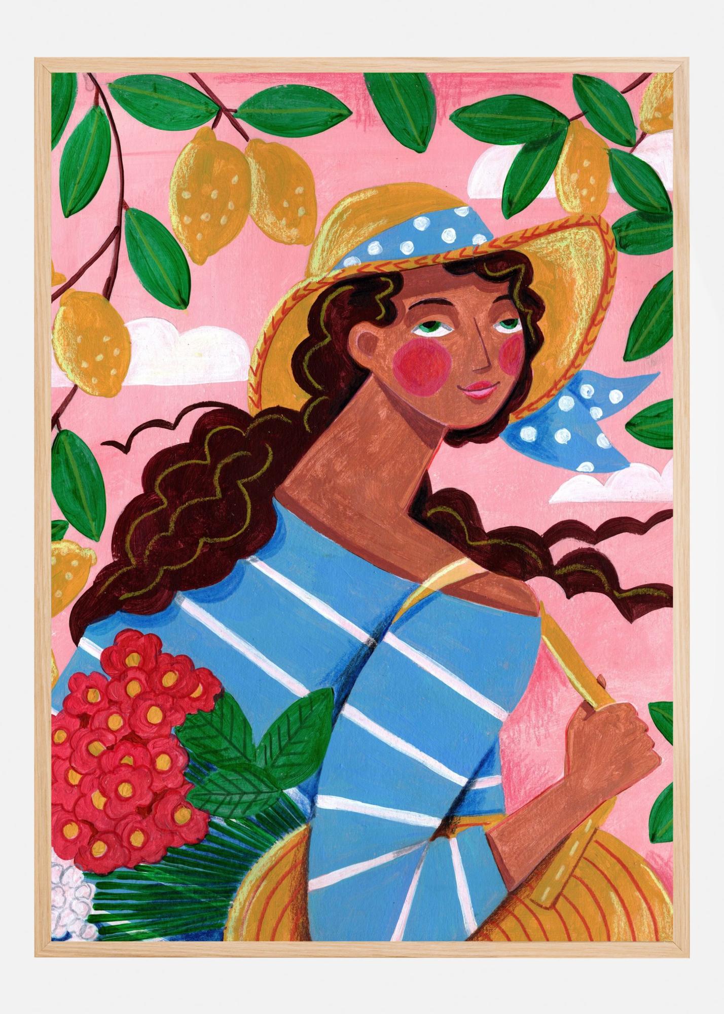 Denna livfulla affisch fångar essensen av sommar och drömmerier med sitt färgglada motiv. En kvinna med flödande brunt hår och en bredbrättad gul hatt står elegant omgiven av citronträd och mjuka rosa nyanser som formar bakgrunden. Hennes klänning, med sina blå och vita ränder, tillför ett maritimt inslag, medan de kontrasterande röda blommorna i hennes korg bjuder in till en känsla av romantik och äventyr.