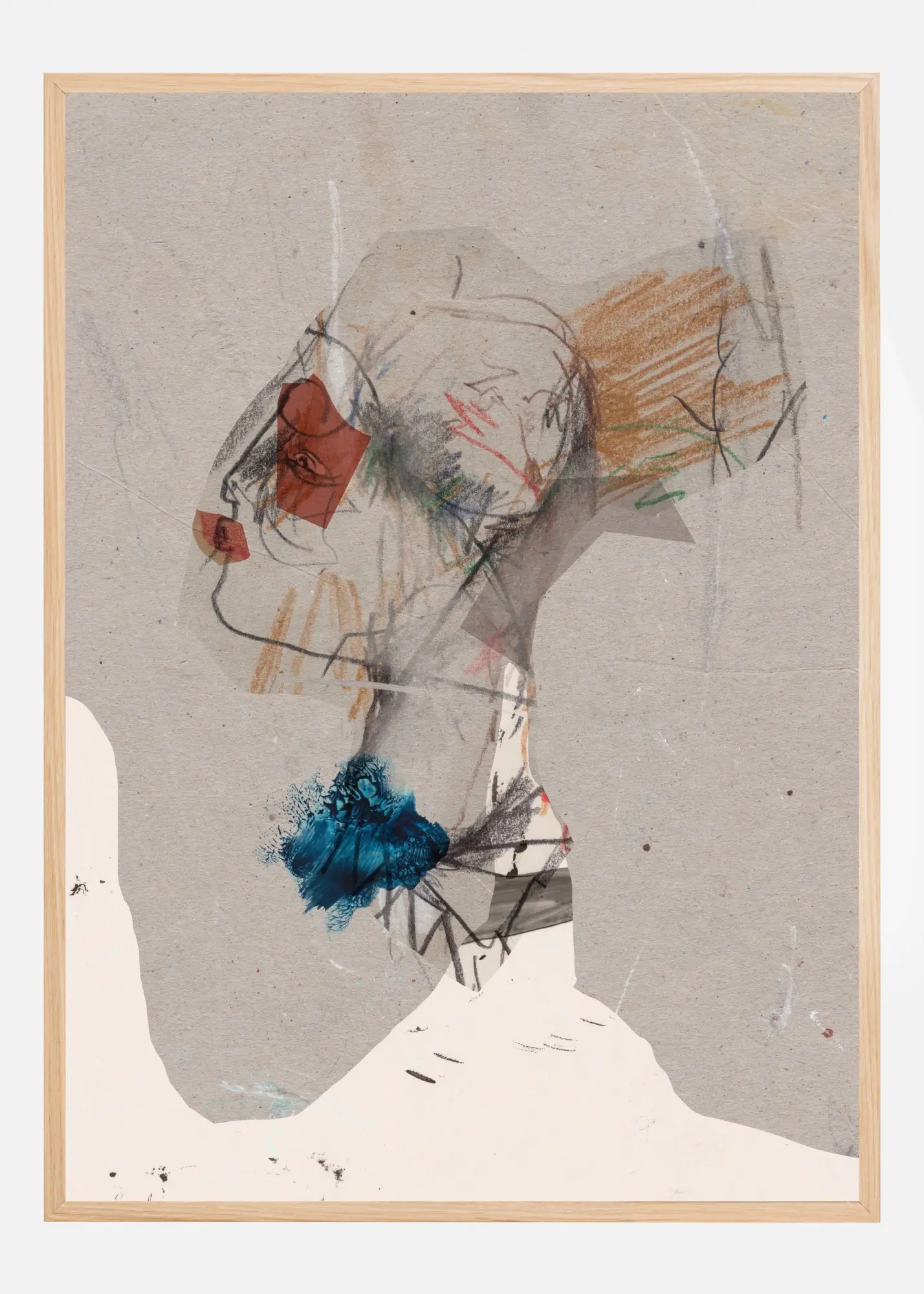 Färgpaletten i detta print består av neutrala toner som grått och beige, med inslag av dämpade röda och bruna nyanser. I kontrast till dessa finns en livfull blå nyans som ger extra dynamik till konstverket. Dessa färger samspelar för att skapa en elegant och sofistikerad atmosfär i ditt rum.