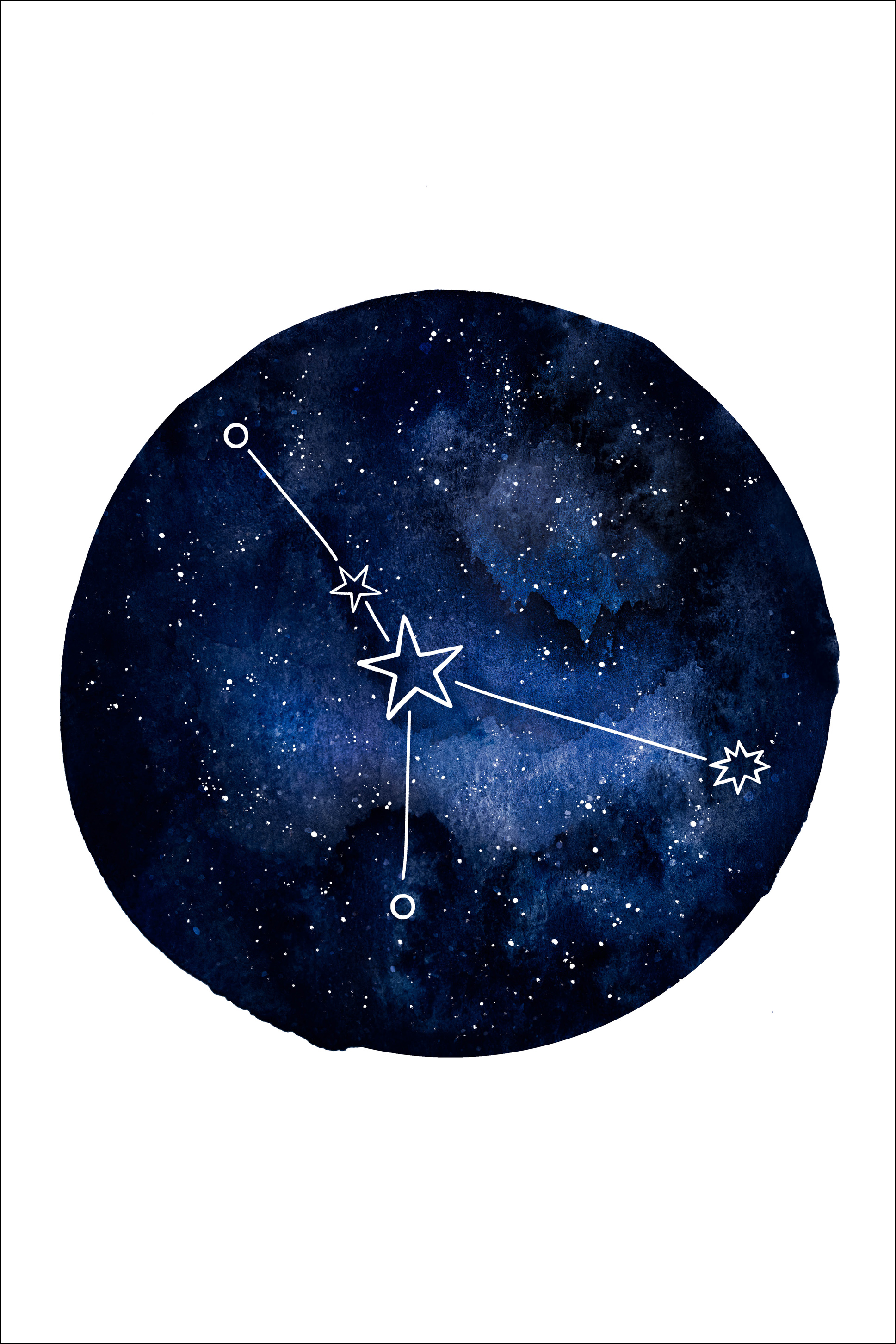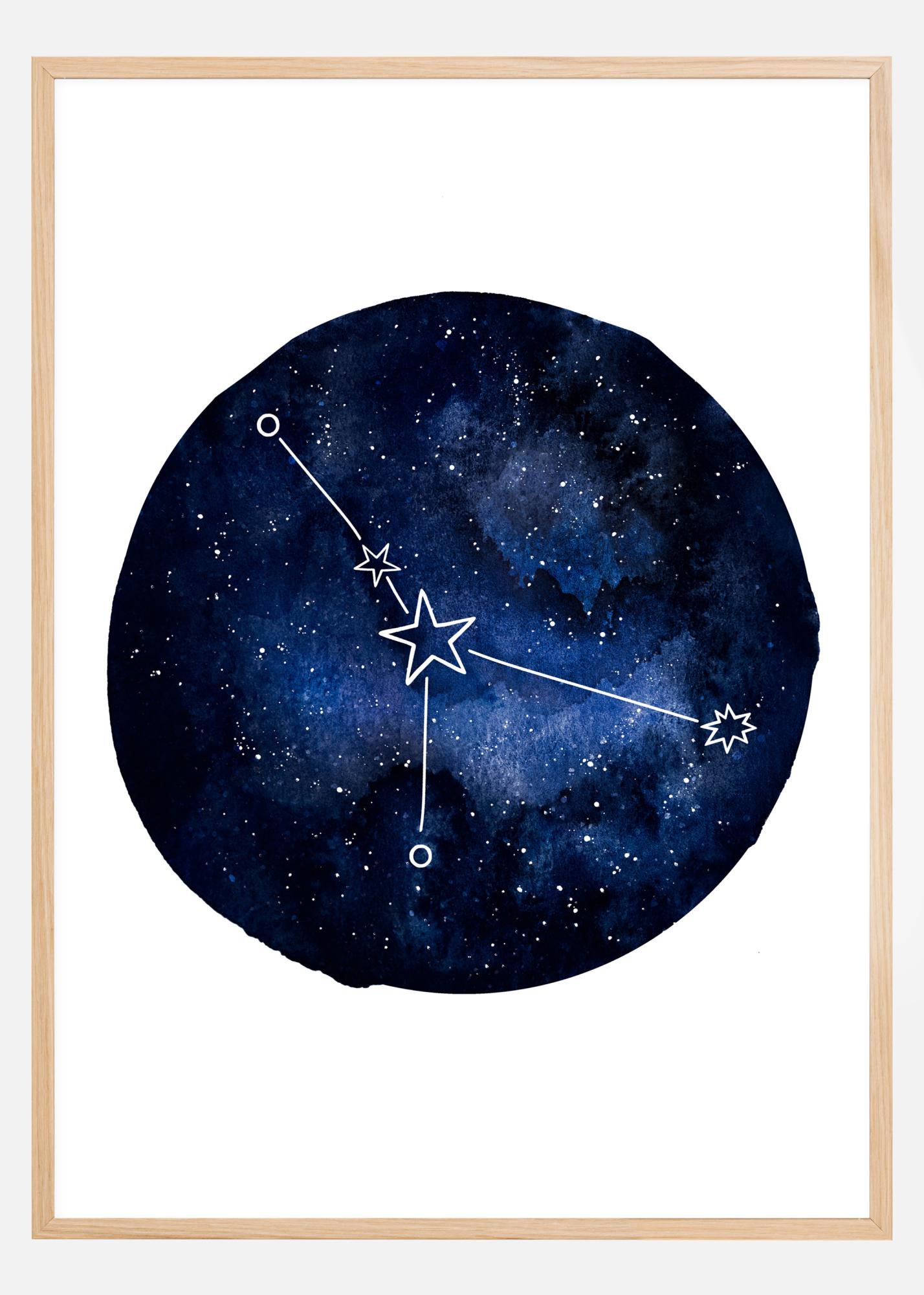 En horoskopsposter med Kräftan. En mörkblå cirkel fyller mitten av den här vita bilden. I cirkeln är olika nyanser av blå såväl som olika stjärnor. Kräftans stjärntecken är framträdande i centrum. Om du älskar ditt stjärntecken är den här bilden ett måste på din vägg.