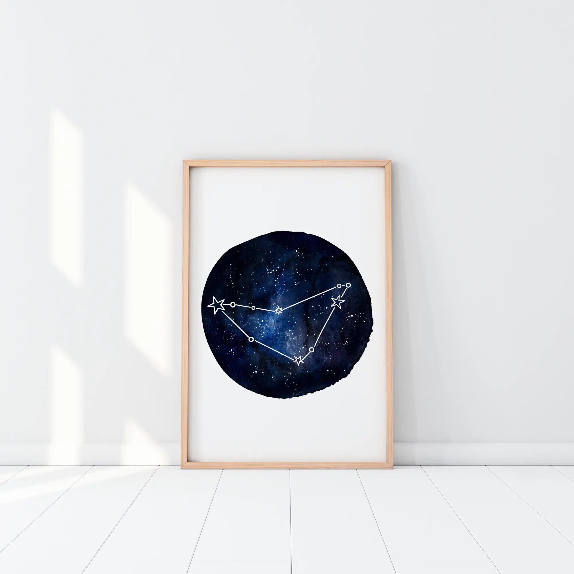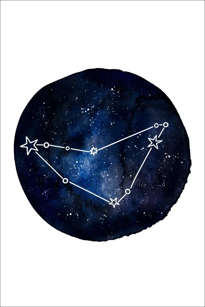 En horoskopsposter med Stenbocken. En mörkblå cirkel fyller mitten av en vit bakgrund. I cirkeln finns en mängd olika blå toner såväl som stjärnor. Den huvudsakliga stjärnbilden är Stenbockens stjärntecken. Häng upp den här om du gillar ditt stjärntecken.
