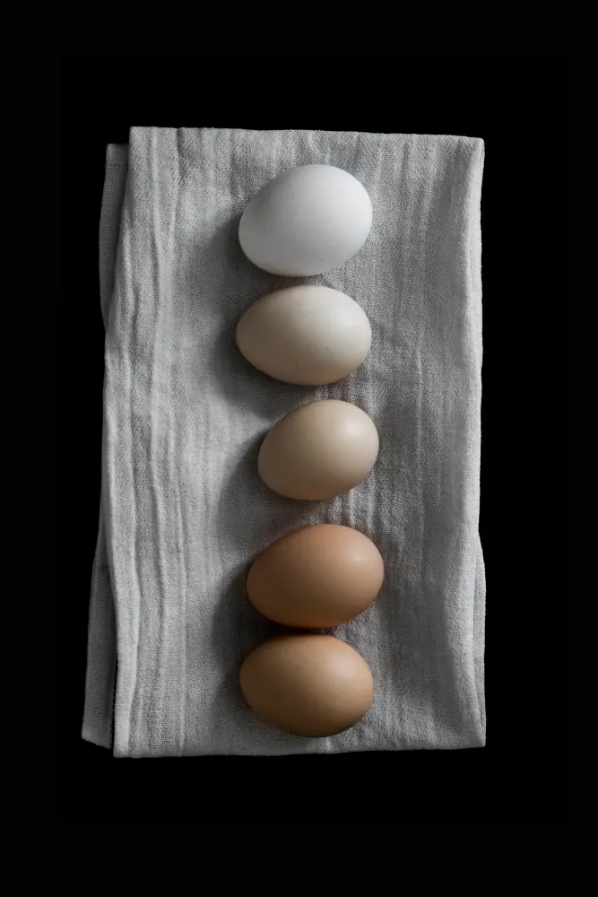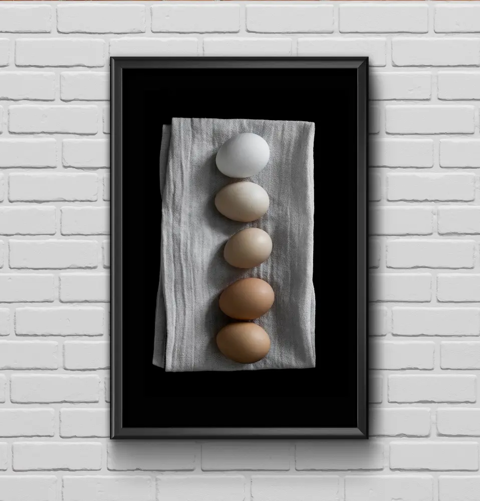 En söt, rustik poster med fem ägg som lagts ut på rad på en vit kökshandduk. Varje ägg är en egen färg och börjar med vit på toppen och går igenom de olika tonerna till brunt längst ner. För en rolig knasig matlagningkänsla, häng den här på din köksvägg.