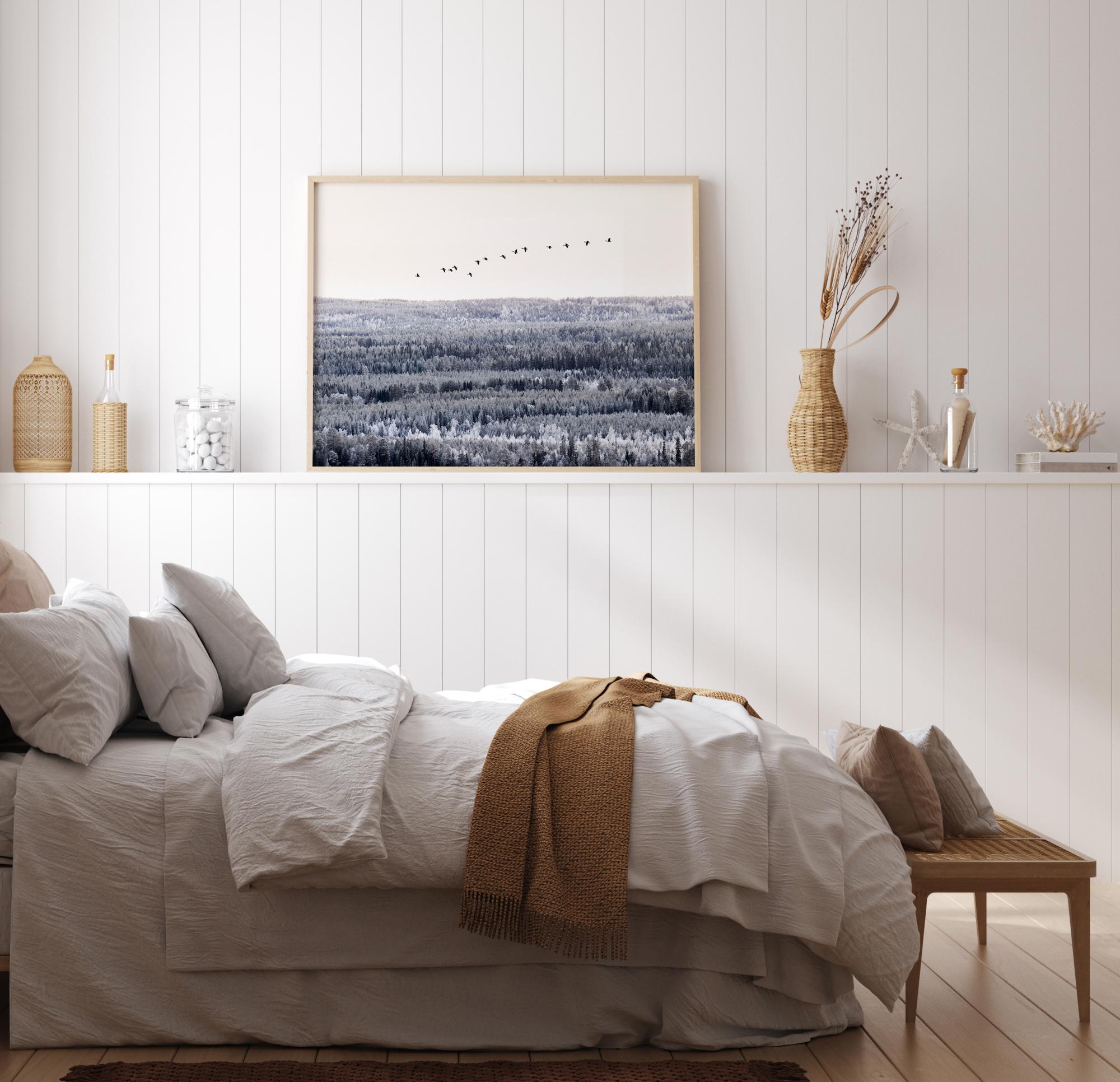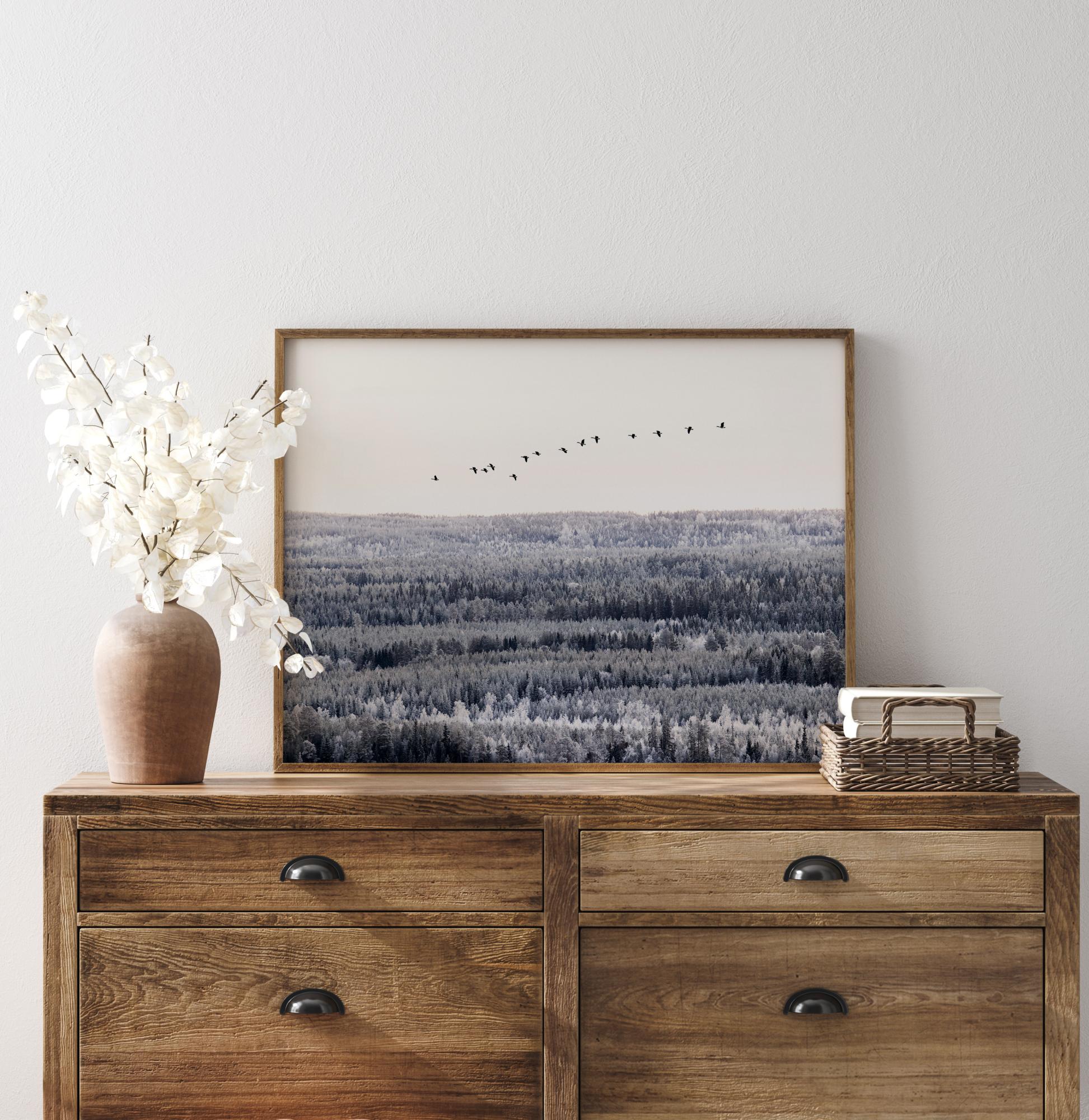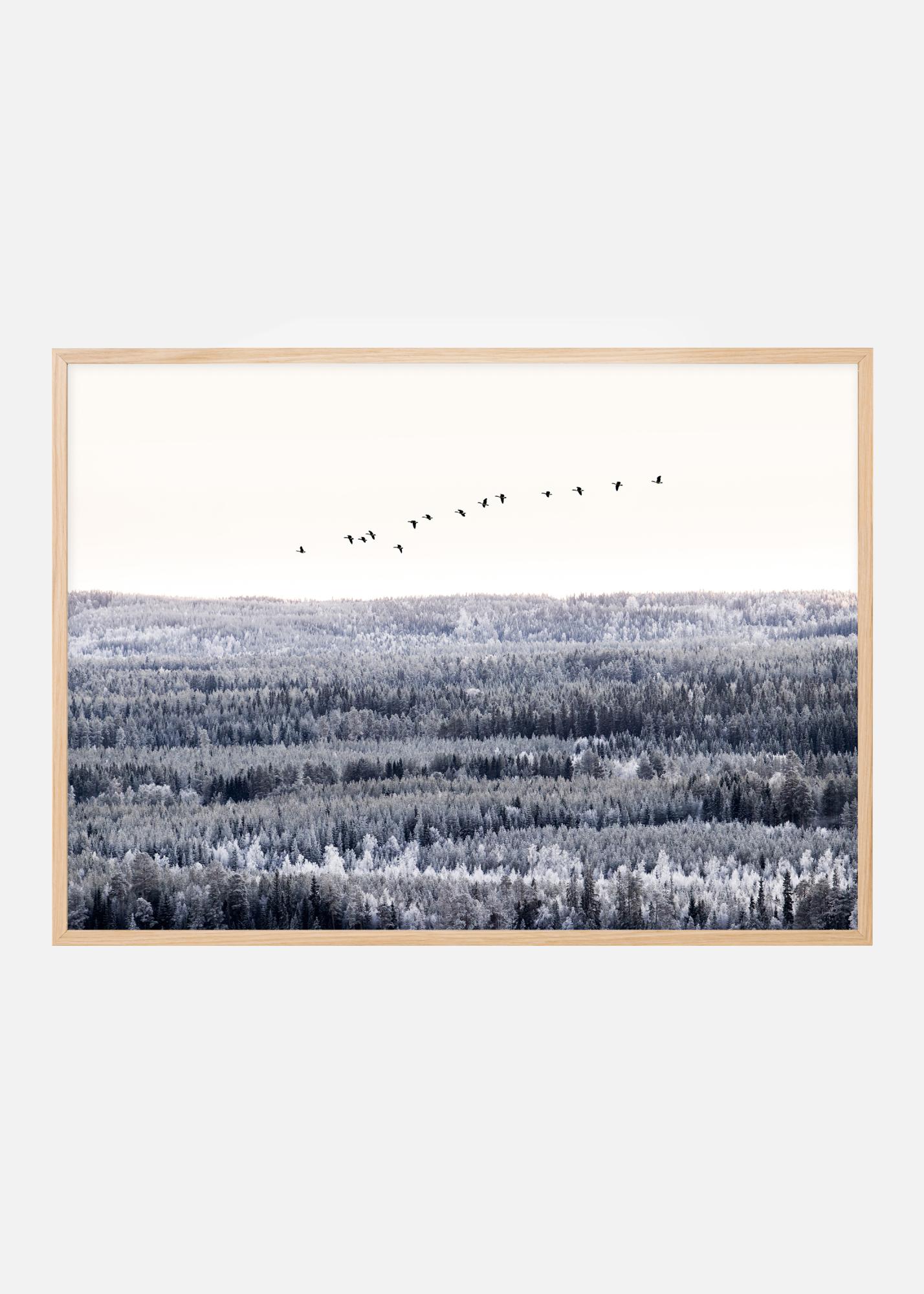 En fotografisk poster över en flock med flyttfåglar som flyger långt över trädens toppar. Den vidsträckta skogen går i svala färgtoner under en vit himmel. En poster som andas en härlig känsla av frihet.