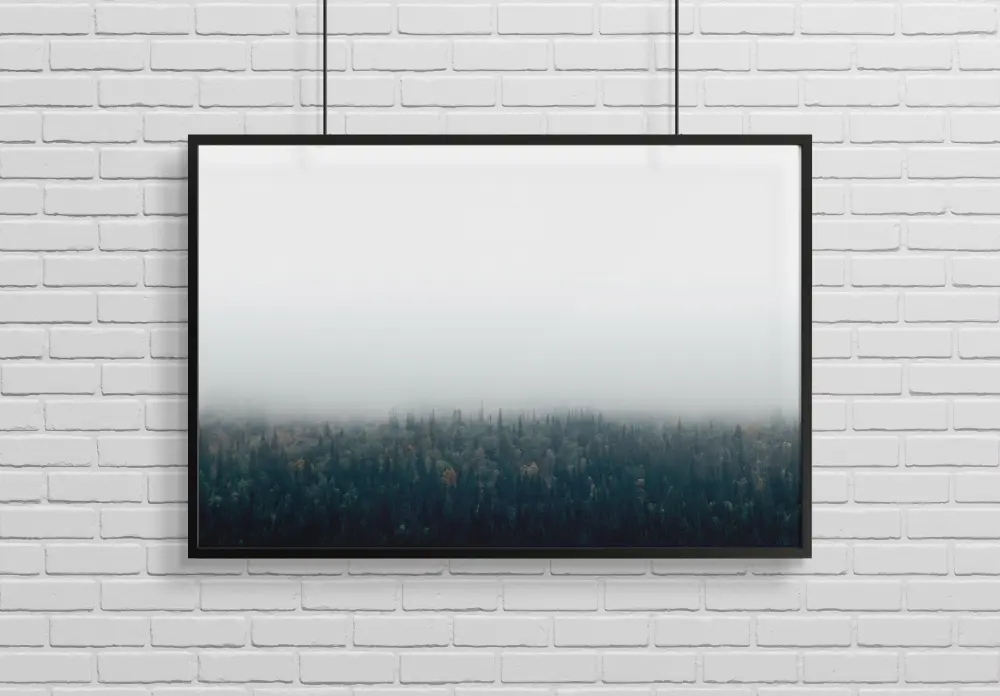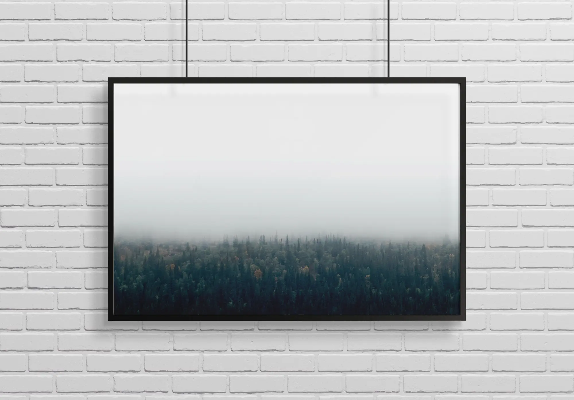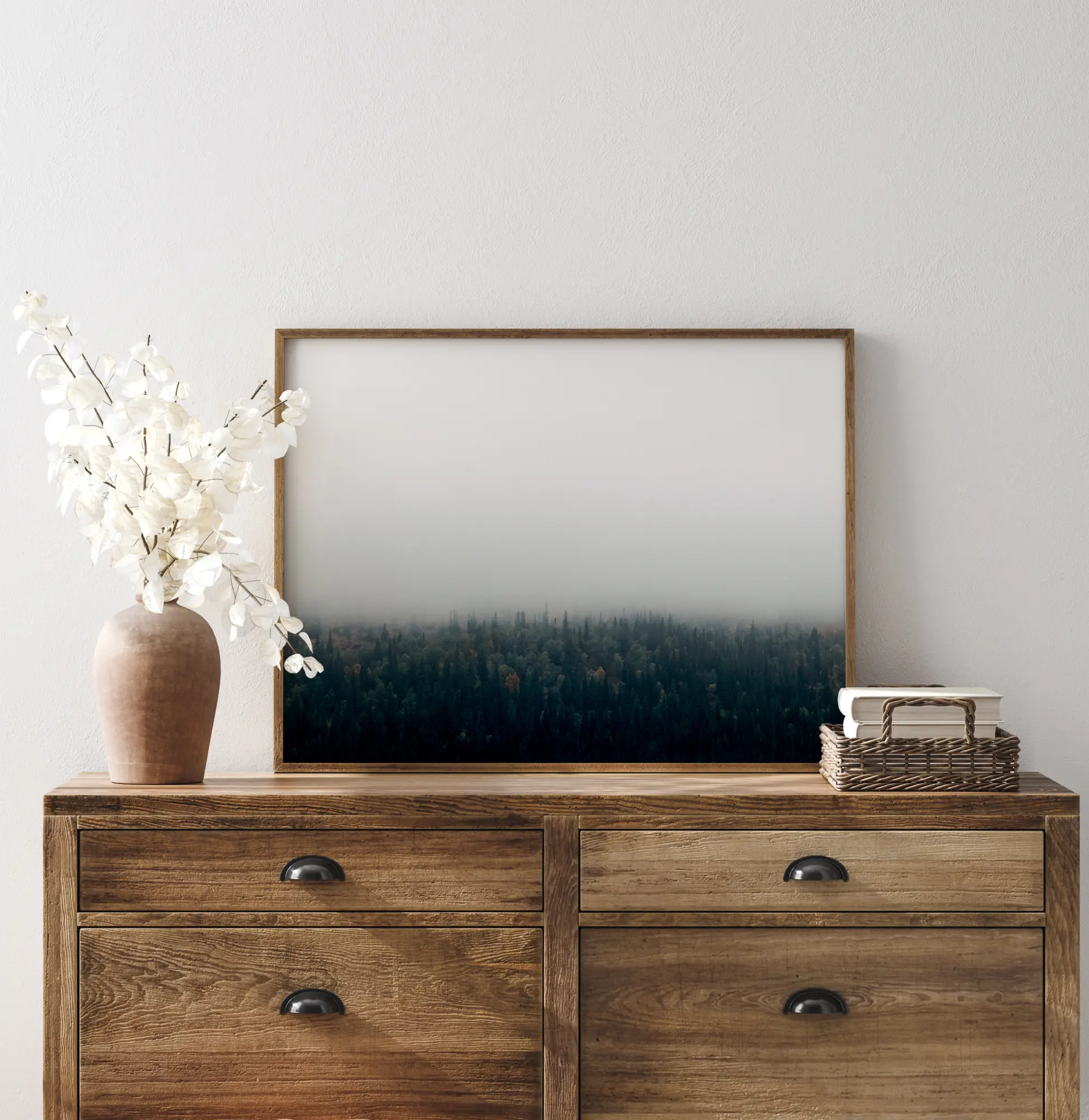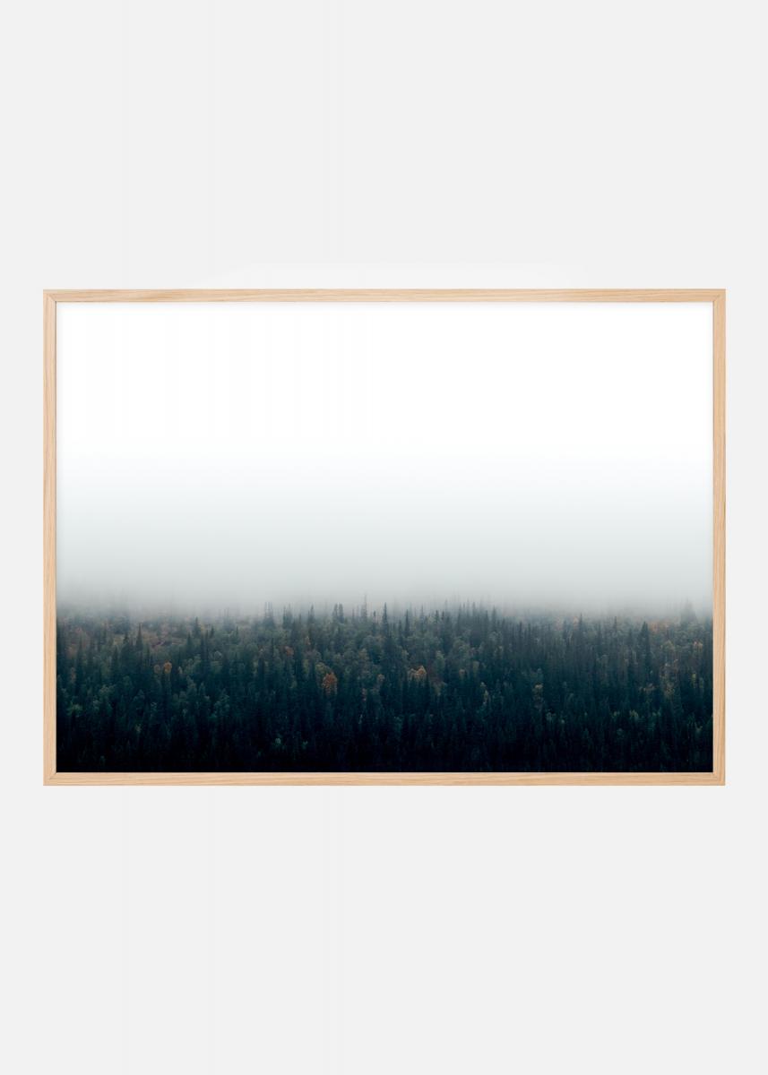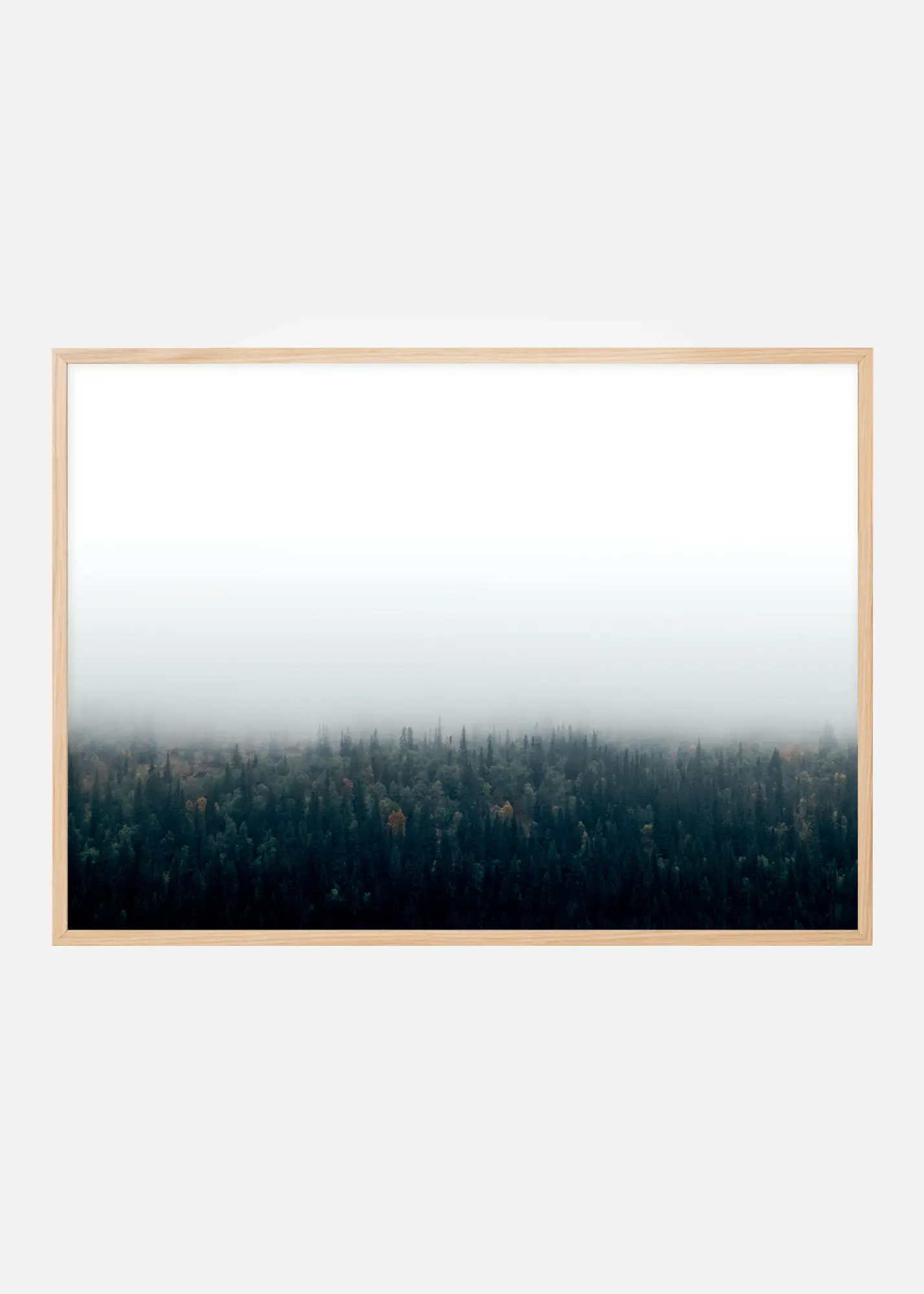 En fotografisk poster över en vidsträkt skog som vilar under tät dimma. De gröna träden kontrasterar skarpt mot den vita himlen. En vacker naturnära poster som är lätt att kombinera med andra favoriter. Varör inte göra en större tavelvägg med temat natur?