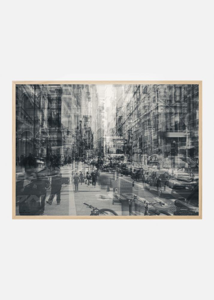 Ett grafisk fotocollage i svartvitt, skapat av fotograf Ingrid Kraiser. Här möter man Manhattans vardagliga myller i en spännande blandning av olika lager. En intressant poster som med fördel kan kombineras med Kraisers Manhattan NYC.