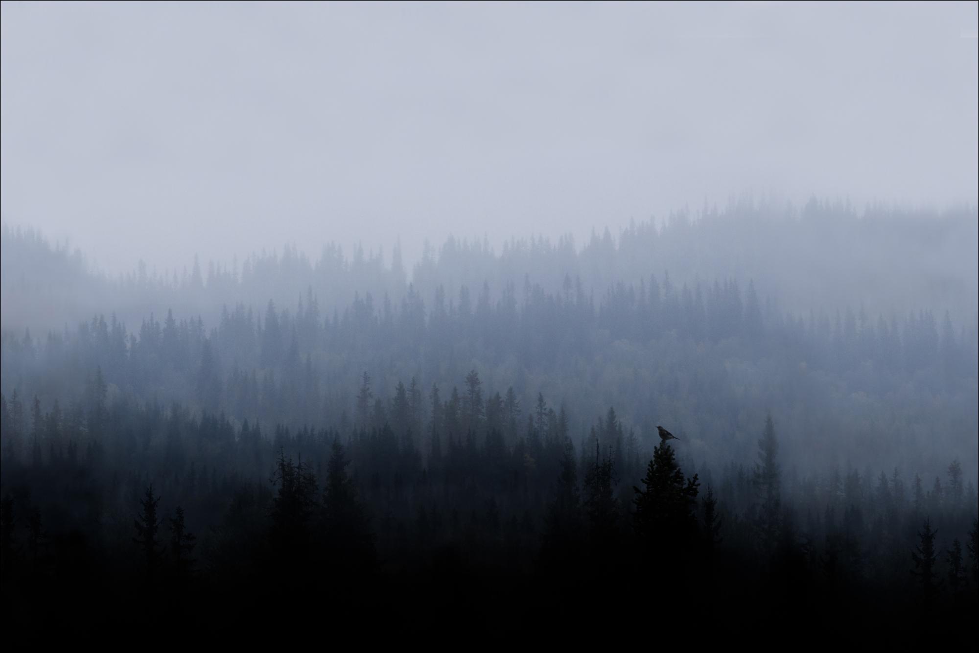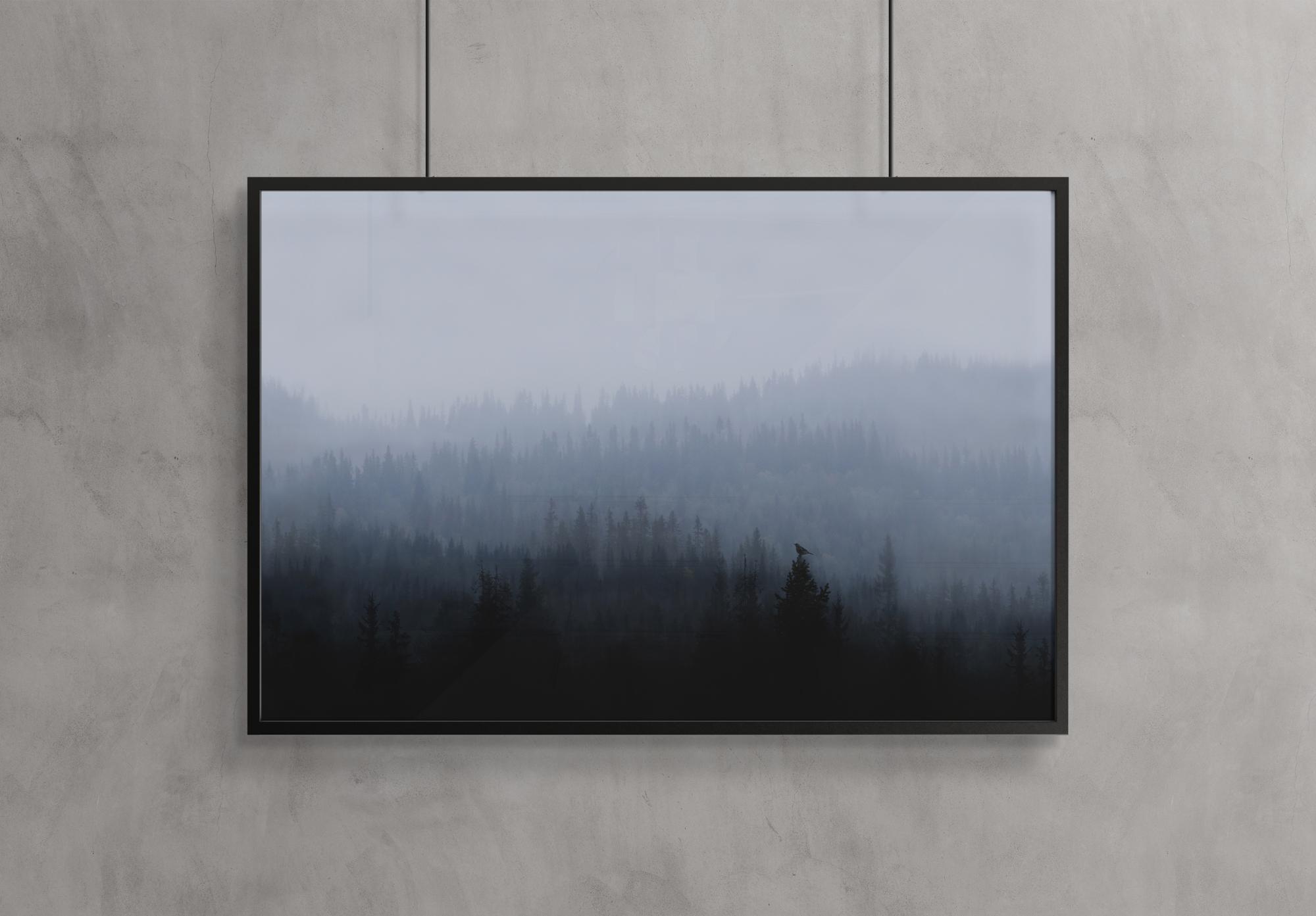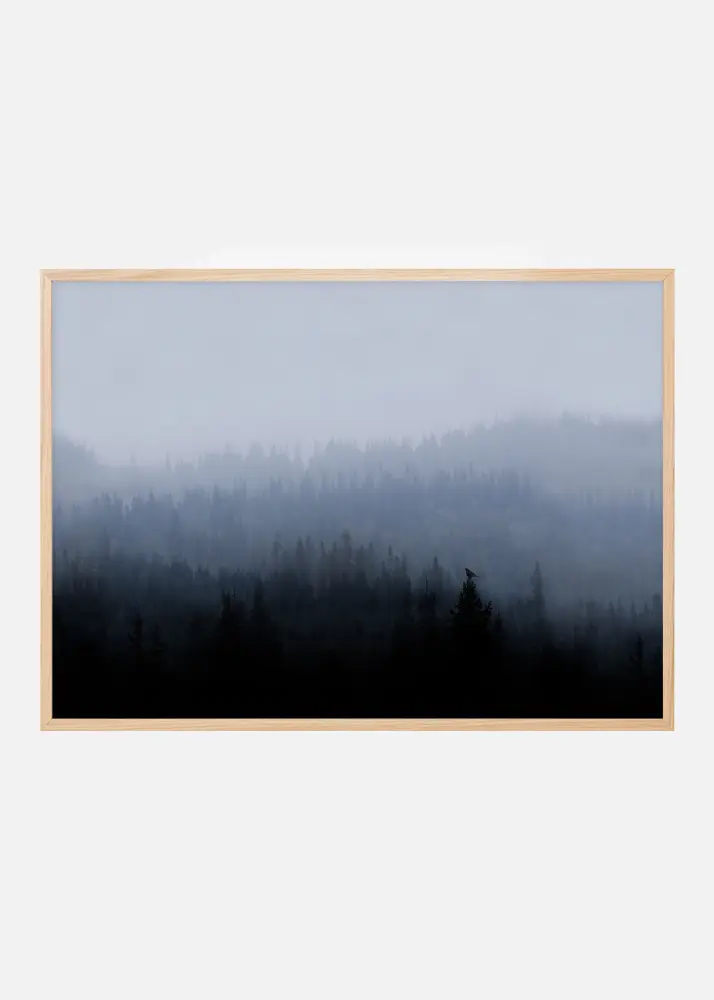 En poster med en kylig morgon på en dimmig skogsklädd bergssluttning. En morgonfågel sitter på toppen av ett träd i förgrunden medan ljuset syns vid horisonten i den kuperade bakgrunden. Den svartvita bilden ger en vinterkänsla till ditt hem.