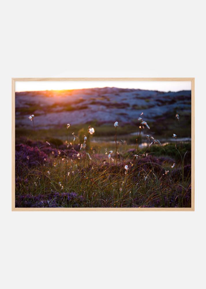 En vacker scenisk poster med vilda blommor som belyses av den nedgående solens röda ljus. Gräs och stenar lyser upp när solen går ner över bergstoppen och skapar en värme denna sommarkväll. Föreställ dig en picknick i detta vackra landskap.