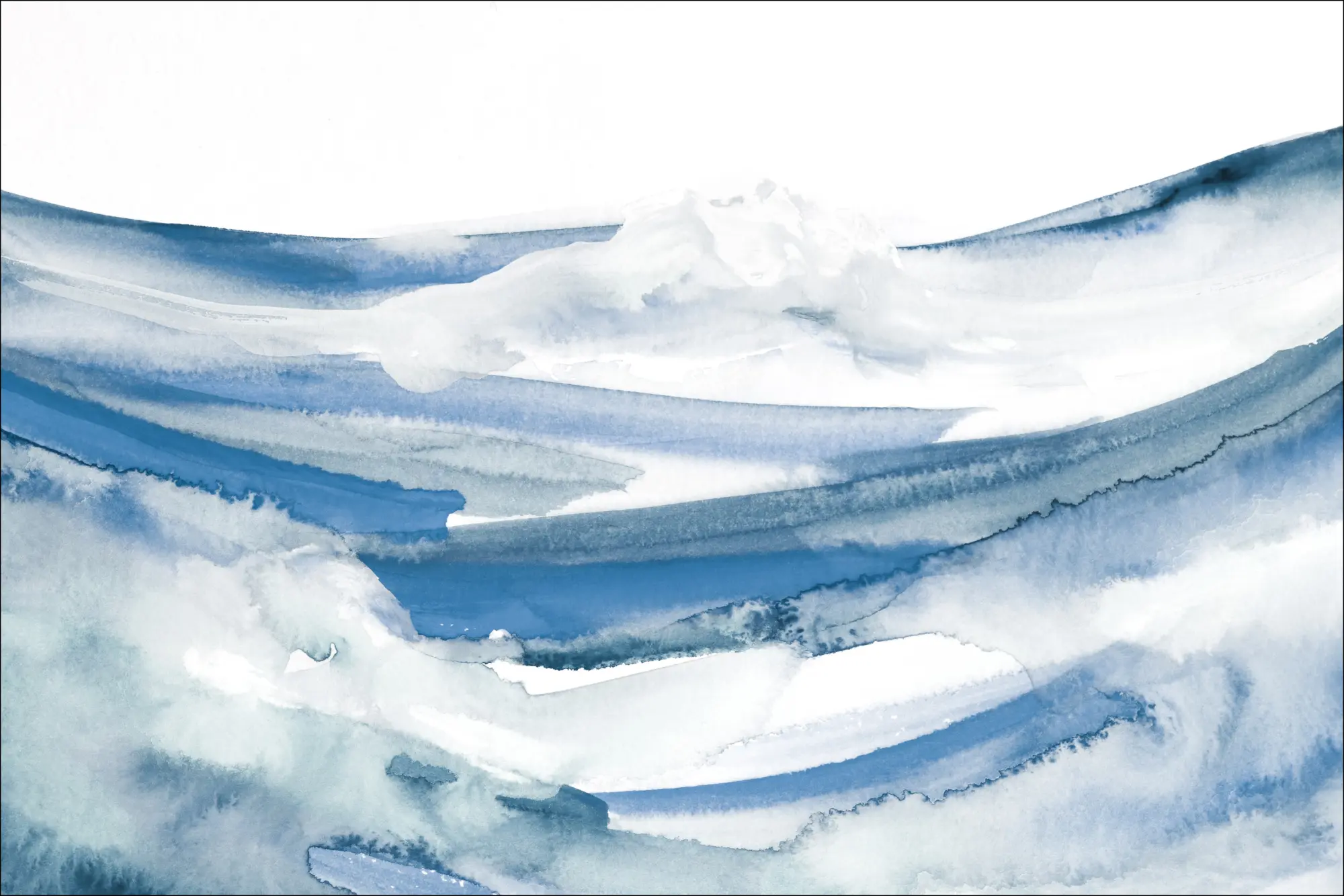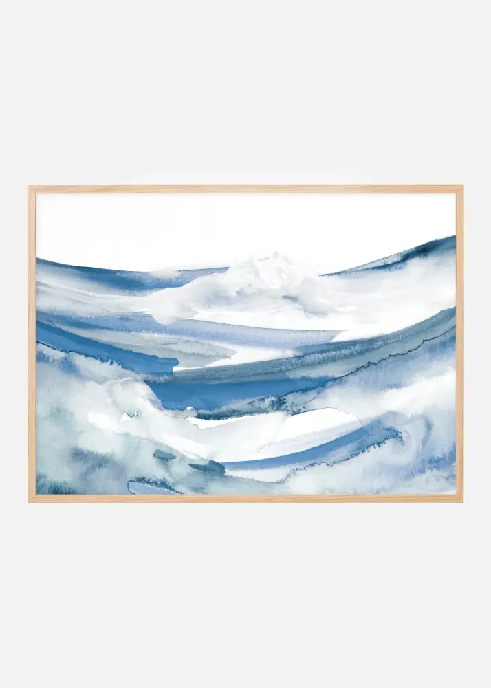 En fantastisk ljus poster med stora penseldrag i blått och vitt. Dessa dramatiska färgstråk skapar en illusion av vågor på ett hav. Mjuka akvarellkanter skapar skum och ger verket en stark känsla av fart när färgen virvlar runt. Ge dina väggar en känsla av rörelse med detta flödande verk.