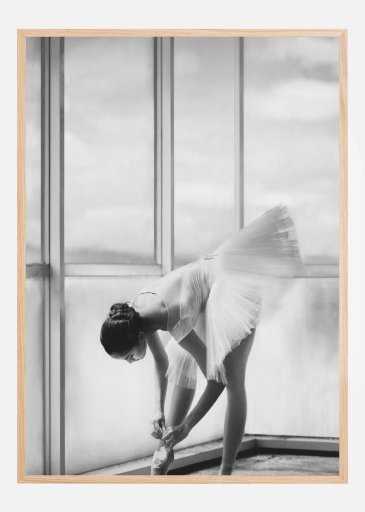 Denna eleganta poster fångar en tidlös ögonblicksbild av en ballerina i förberedelse, vilket ger ett känsla av lugn och koncentration. Det svartvita motivet framhäver skönheten och styrkan i dansarens form, samtidigt som det erbjuder en klassisk och stilren estetik som passar alla inredningar. Perfekt som print för att tillföra grace och rörelse i ditt hem.