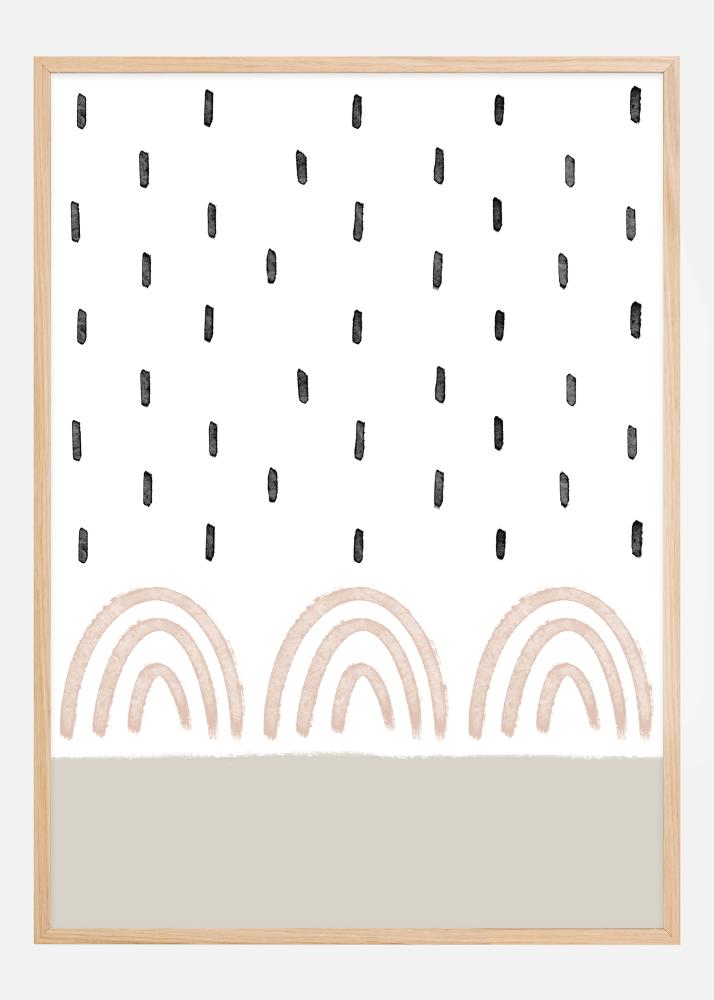 Denna konstnärliga affisch, "Rain on Rainbows", kombinerar lekfullhet och minimalism på ett unikt sätt. Motivet presenterar en bakgrund med vattenfärgade regnbågar i milda nyanser av terrakotta mot en ren vit bas. Över dessa mjuka bågar syns en samling av abstrakta, penselströk som liknar regn, svävande i en oordnad symmetri. Färgerna i regnbågarna kontrasterar vackert mot de tuschsvarta "regndropparna", vilket skapar en dynamisk, men ändå harmonisk bild.