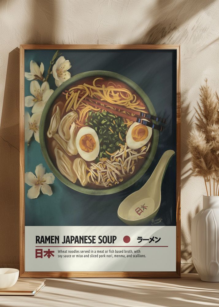 Färgpaletten i denna print är rik och inbjudande, med varma bruna och gyllene toner från buljongen och nudlarna, kompletterade av det fräscha gröna från löken och böngroddarna. Skålens djupa gröna nyans ger en harmonisk bas till motivet, medan de vita blommorna i bakgrunden tillför en elegant, asiatisk detalj. Denna affisch är ett måste för den stilmedvetna och matintresserade inredningsentusiasten.