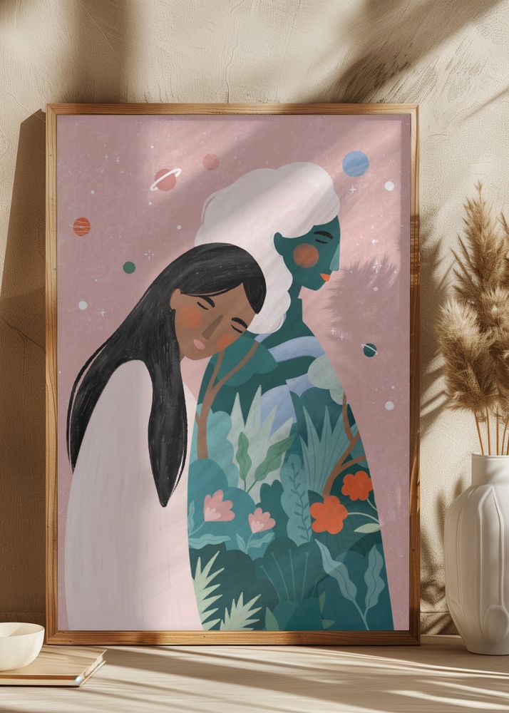 Färgerna i detta motiv inkluderar mjuka rosa nyanser som bakgrund, med inslag av djupt gröna toner i växtmotiv och kläder. De två figurerna är i nyanser av blått, brunt och beige, med små detaljer i rött och vitt. Planetdetaljerna i bakgrunden ger ytterligare dimension med sina orange och vita accenter. Denna blandning av färger skapar en harmonisk och visuellt tilltalande poster.