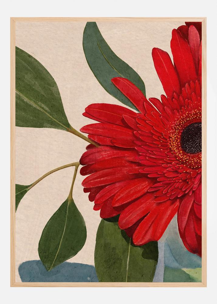 Denna livfulla poster fångar ögat med sitt stora, djärva blomsterarrangemang. Motivet har en vacker blomma i en intensiv röd ton, som förmedlar en känsla av passion och energi. De detaljerade kronbladen sträcker sig ståtligt ut och skapar en stark kontrast mot de mjukare, mörkgröna bladen i bakgrunden.