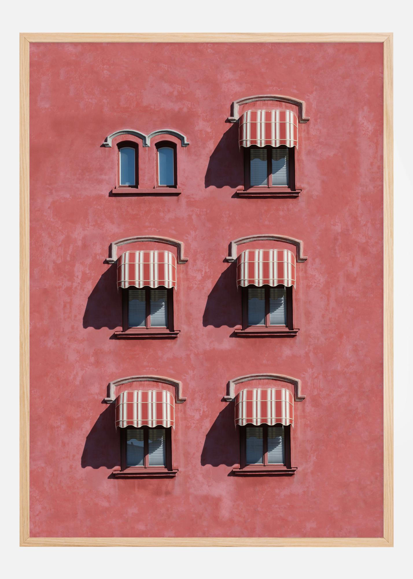 Denna eleganta och sofistikerade affisch, "Red Wall", är ett uppvisande av arkitektonisk harmoni och visuell balans. Sex fönster, varje med en distinkt markis, pryder den livfulla röda fasaden och ger en rytmisk symmetri som är både lugnande och tillfredsställande för ögat. Solens lekfulla dans över ytan ger liv åt strukturen och skapar en lek mellan ljus och skugga.