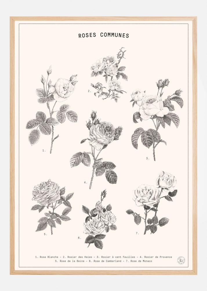 Denna eleganta poster visar detaljerade illustrationer av olika rosorter, vilket ger en känsla av tidlöshet och skönhet. Varje ros är noggrant ritad med fokus på detaljer och form, vilket gör detta print till det perfekta tillskottet för den som älskar klassiska botaniska motiv. De latinska namnen bredvid varje blomma ger en lärorik touch och förhöjer väggkonstens sofistikerade stil.