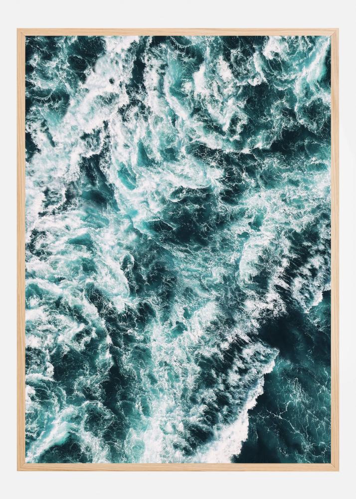 Denna poster fångar den mäktiga kraften hos ett stormande hav, där vågornas virvlar och kaskader skapar ett hypnotiserande mönster. Havets intensiva rörelse ger en känsla av både rå energi och naturlig skönhet, perfekt för att ge liv åt alla rum. Det är en print som pryder sin plats både som solitär och som del av en större väggkomposition.
