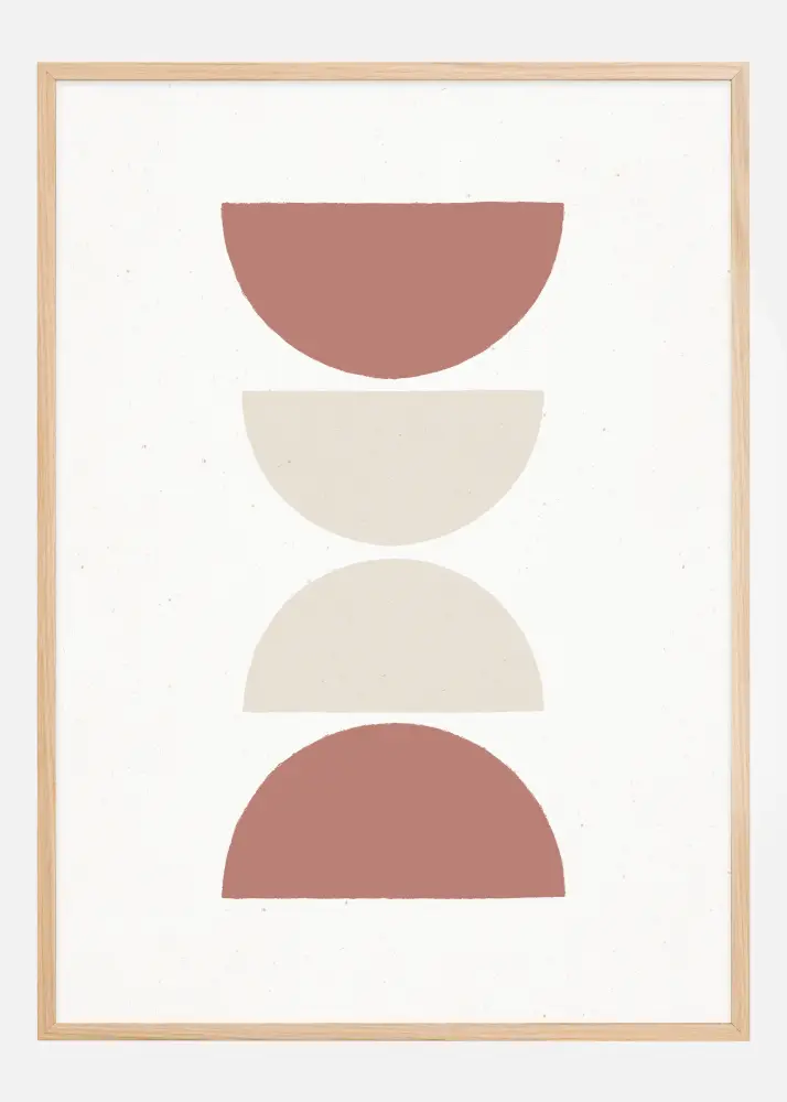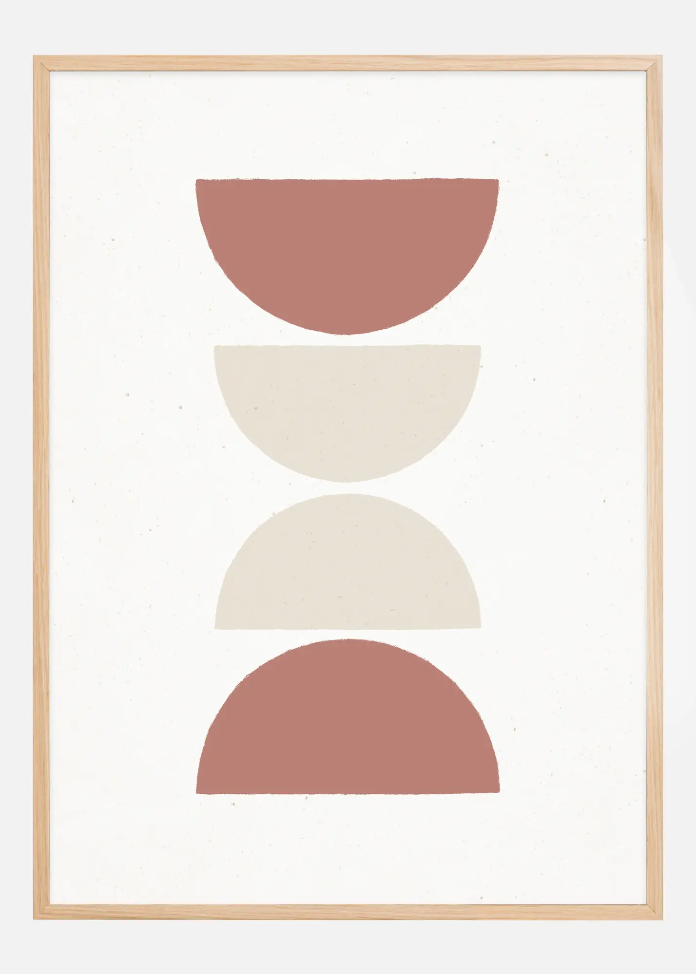 Denna sofistikerade affisch, betitlad 'Rust and Sand - Lungo', fångar blicken med sitt enkla men djärva arrangemang av halvcirkelformer. De ligger staplade ovanpå varandra i en lugnande symmetri, vilket skapar en vertikal dynamik på den vita bakgrunden. Med sin diskreta palett av rostigt rött och sandigt beige är denna print en hyllning till det sublimt enkla och ger en varm och jordnära känsla till varje utrymme den placeras i.