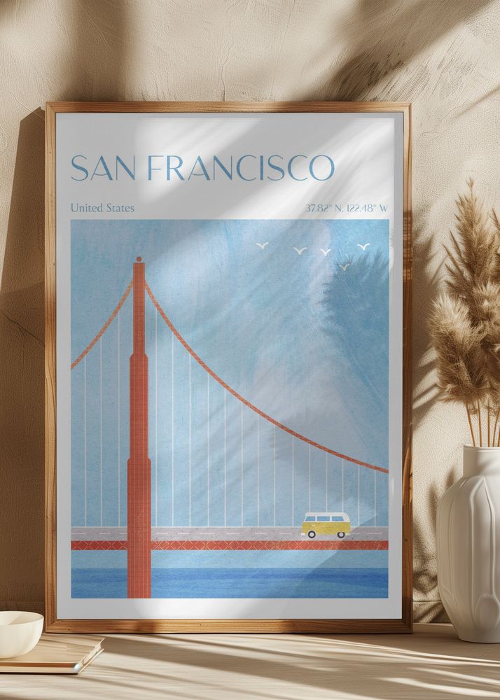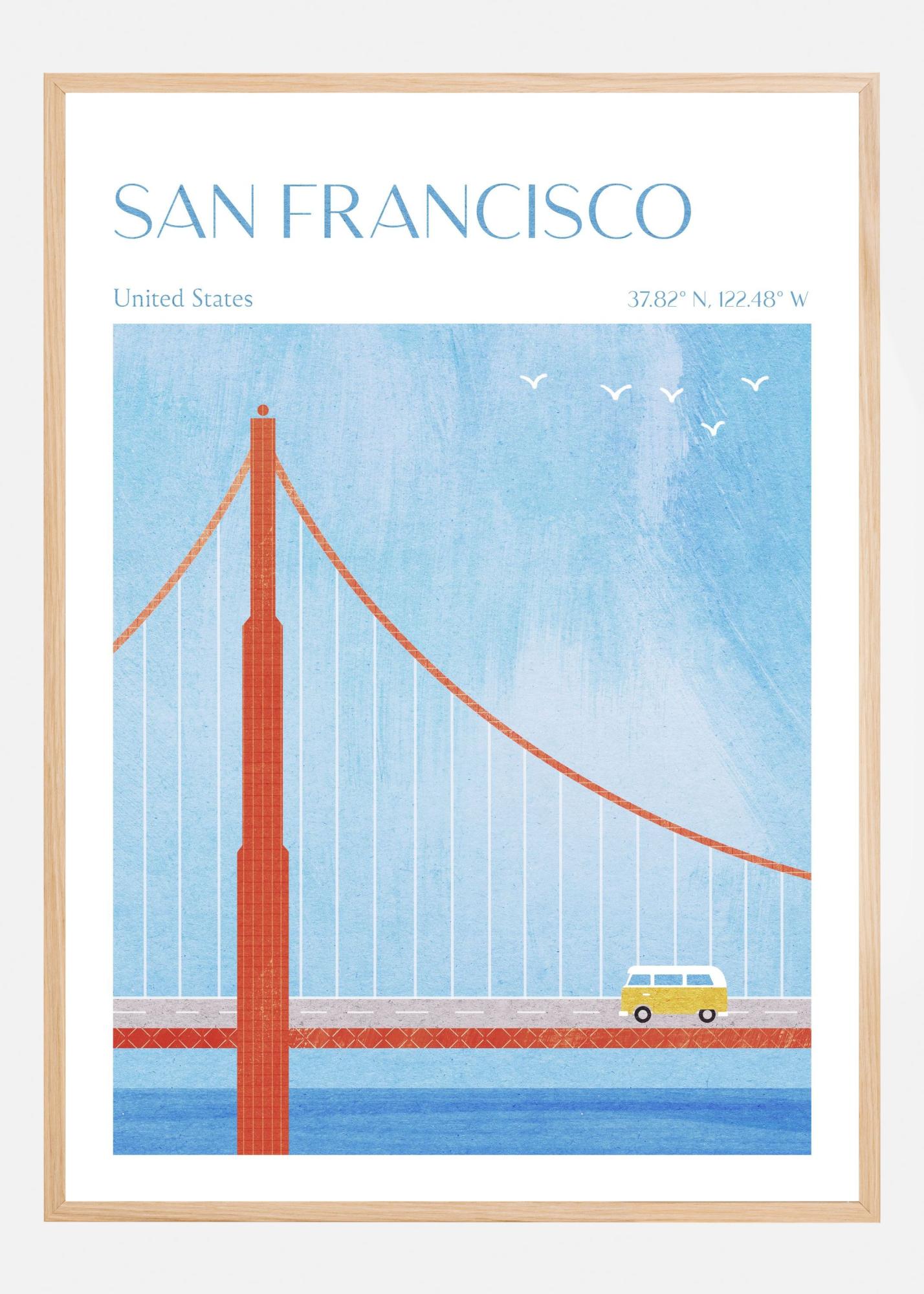 Denna stilrena poster avbildar den ikoniska Golden Gate-bron i San Francisco, USA, och fångar platsens unika atmosfär. Motivet domineras av broens karakteristiska orange-röda färg som framträder vackert mot en klarblå himmel. En liten gul buss syns åka över bron, vilket ger en nostalgisk känsla och transporterar betraktaren till en tid då resandet var lite enklare.