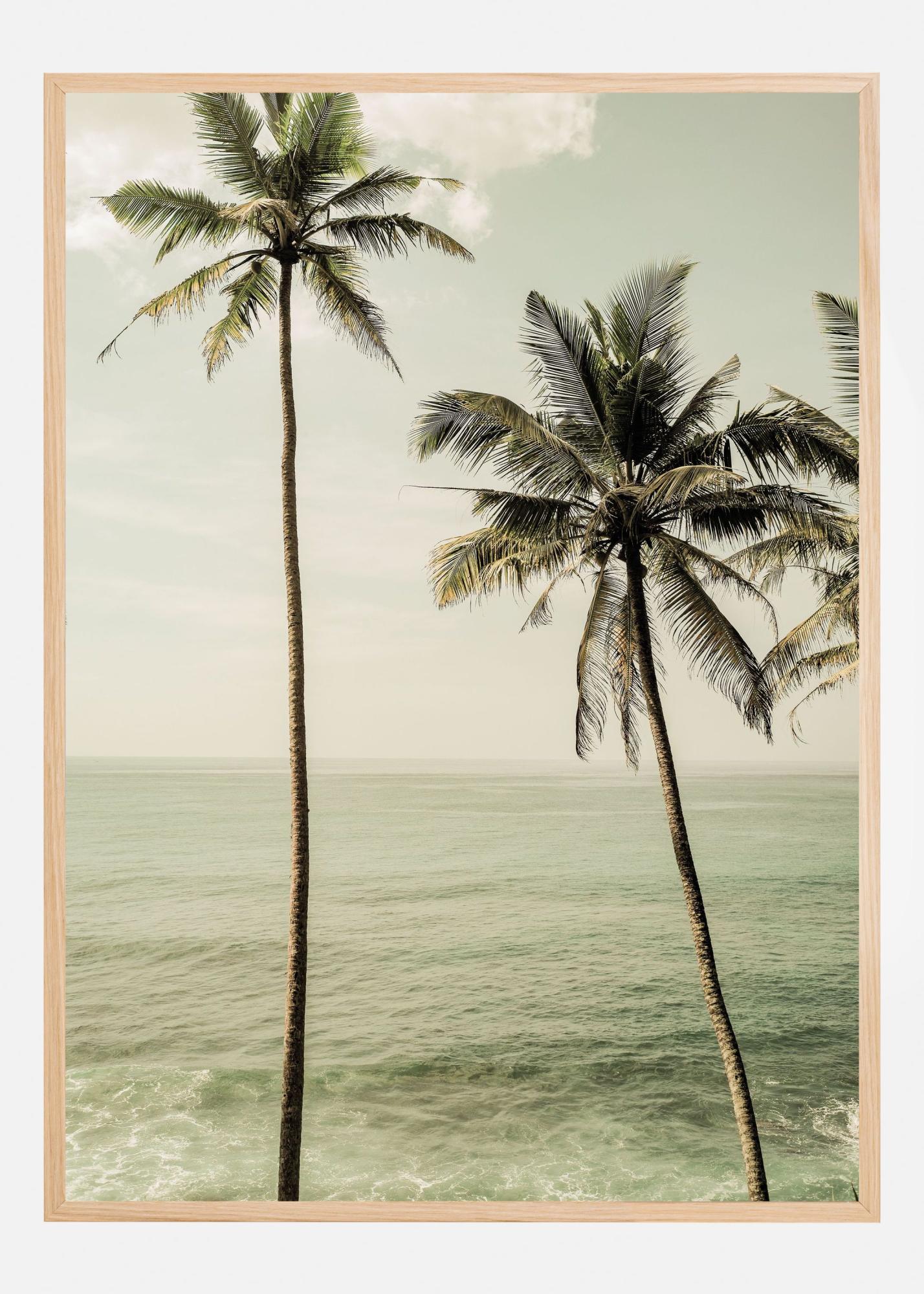 Motivet domineras av mjuka, naturliga färger som grönt, blått och beige. Den subtila kontrasten mellan palmernas mörkgröna blad och himlens ljusblå toner skapar en rogivande balans. Vågor och havets olika gröna nyanser förstärker känslan av sommar och frihet i denna stilfulla print. Perfekt för den som älskar minimalistisk och naturnära konst i sitt hem.