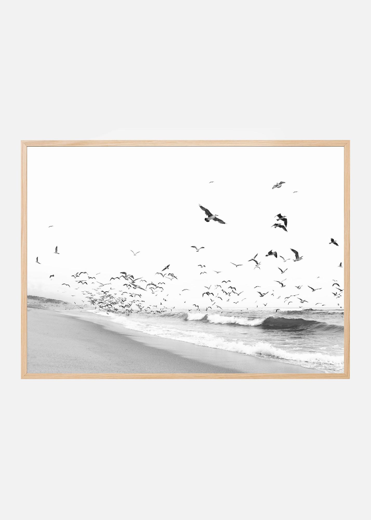 Motivet är huvudsakligen i svart och vitt, vilket gör det enkelt att matcha med olika inredningsstilar och färgscheman. Svarta silhuetter av fåglar kontrasterar mot den ljusa himlen och stranden, vilket skapar en dynamisk och tidlös affisch för den moderna inredaren.