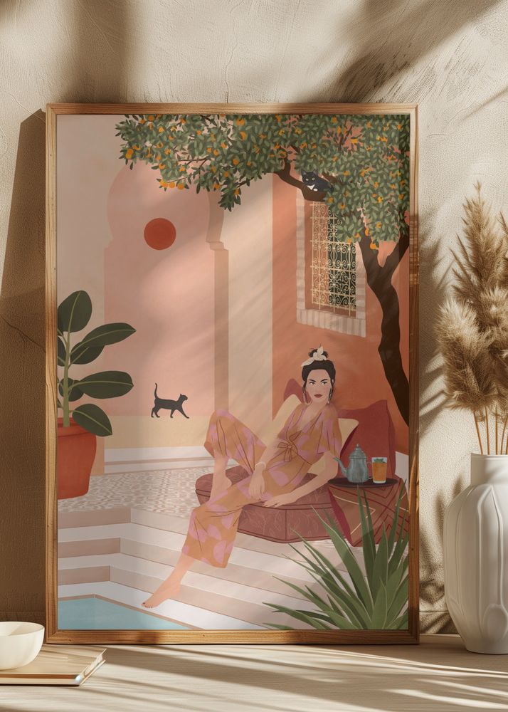 Denna eleganta poster fångar en avslappnad sommardag med en kvinna som vilar bekvämt på en terrass. Hon sitter avslappnat bland kuddar med en vilande pose, omgiven av frodiga växter och utsikt över en pool. Denna harmoniska print ger en känsla av ro och semester, och är perfekt för att förhöja atmosfären i vilket rum som helst.