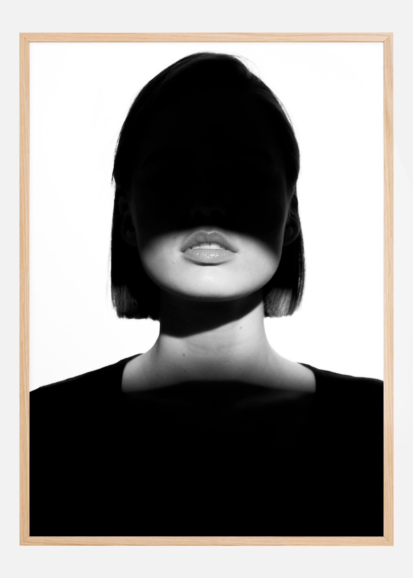Denna slående poster fångar en kraftfull bild av en kvinna vars ögon är dolda av en mörk skugga, vilket ger en mystisk och tankeväckande effekt. Den skarpa kontrasten mellan de vita höjdpunkterna och de djupa svarttonerna accentuerar hennes markerade läppar och skulpturala ansiktsdrag. Det är en bild som balanserar på gränsen mellan synlighet och anonymitet, ljus och mörker, och som lockar betraktaren att söka efter djupare meningar.