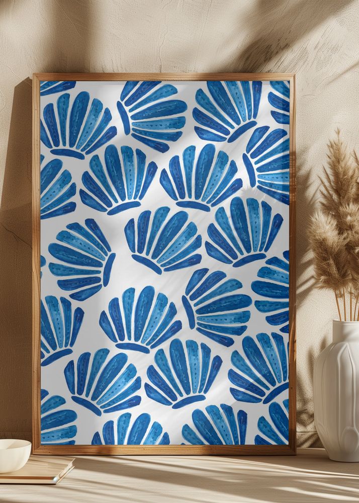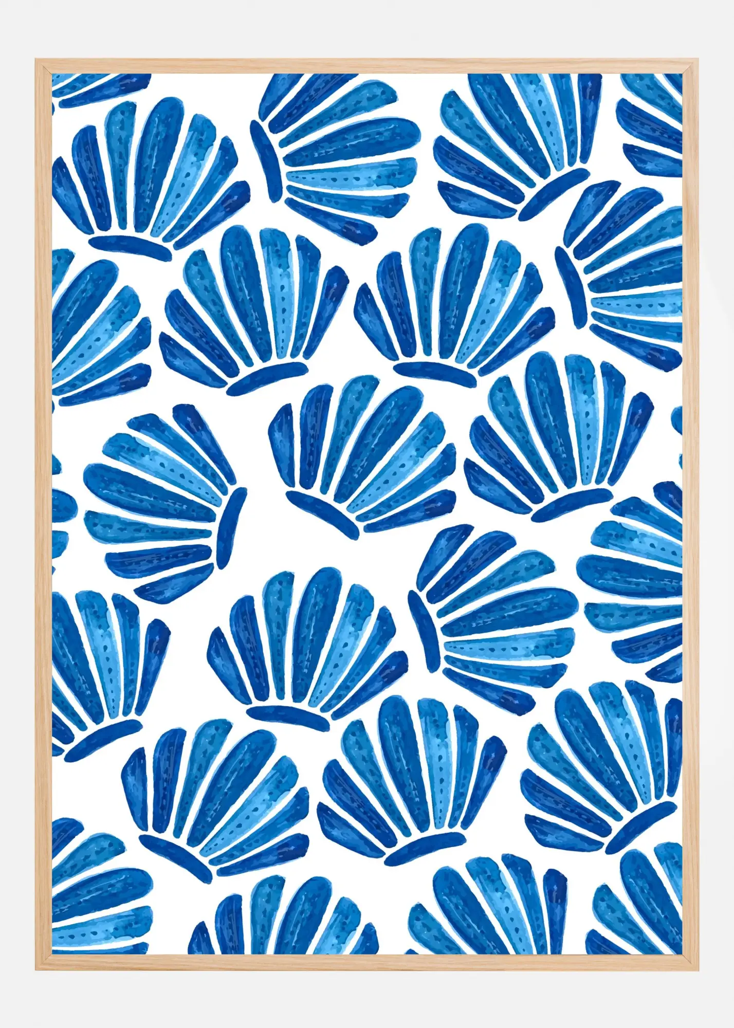 Denna poster har ett livfullt mönster av stiliserade musselskal som ger en känsla av havet och stranden. Motivet präglas av en modern och trendig design som passar perfekt i ett stilrent hem eller sommarstuga. De blåa nyanserna mot den vita bakgrunden skapar en harmonisk och uppfriskande atmosfär.