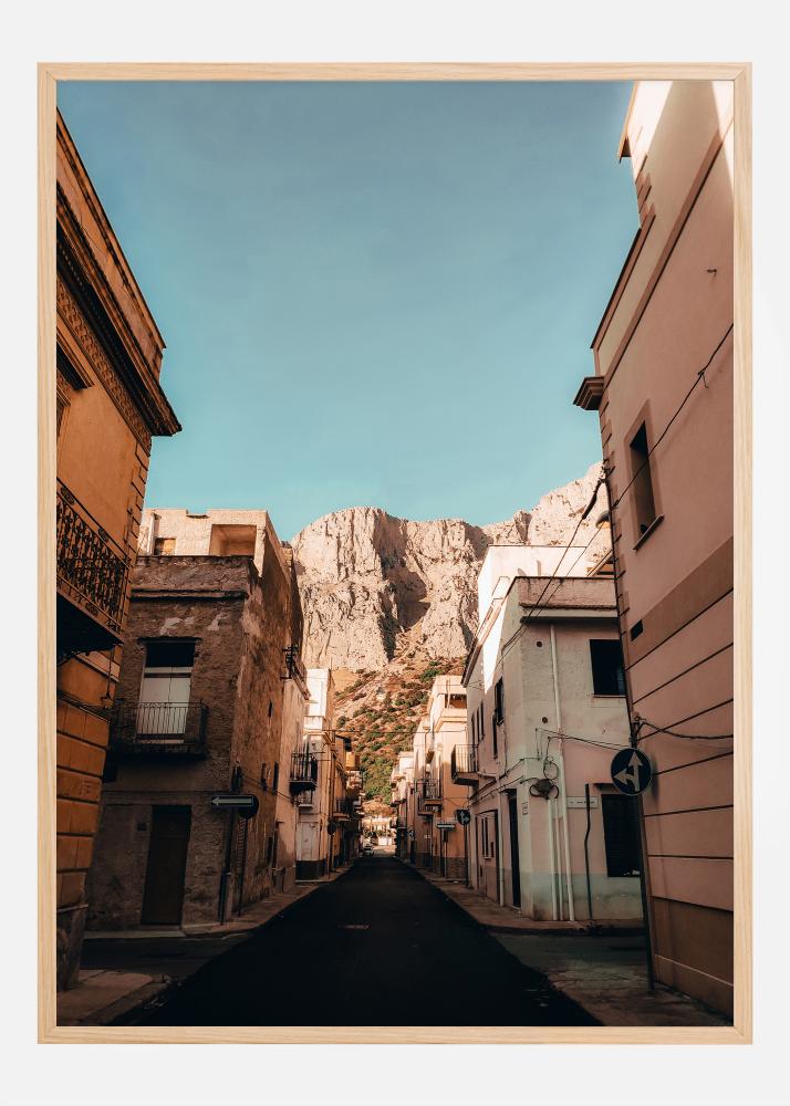 Denna förtrollande poster fångar essensen av en pittoresk gata i den Sicilianska byn Cinisi, med dess varma jordfärger och en bakgrund av det imponerande berget som reser sig mot en klarblå himmel. Byggnadernas blekrosa och gula toner står i vacker kontrast till den råa bergsterrängen i bakgrunden och ger en känsla av lugn och stillhet. Detta print är en hyllning till Siciliens rustika charm och dess förmåga att förena natur och kultur i en harmonisk helhet.