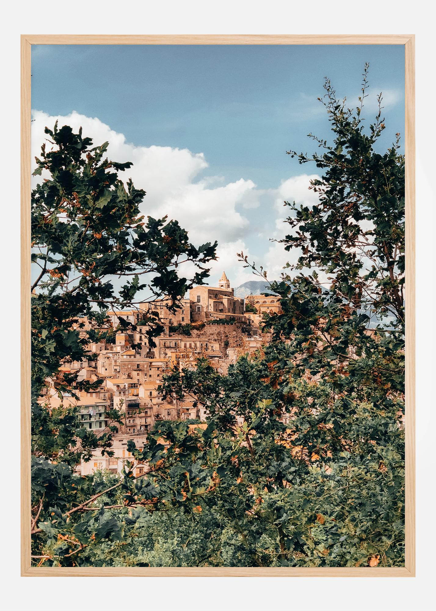 Denna detaljrika poster fångar blicken med en levande vy över en medeltida stad som klättrar uppåt mot en himmel av moln och blå. Staden, som är belägen i hjärtat av Sicilien, är rik på historia och kultur, vilket syns i de varmt tonade byggnaderna och de historiska kyrktornen. Omringad av grönskande lövverk ger denna affisch en känsla av att upptäcka en dold pärla, en plats där varje sten och tak har en berättelse att berätta.