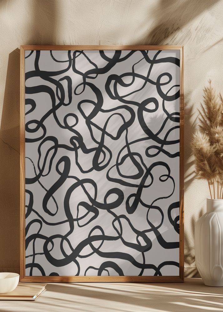Denna poster erbjuder ett elegant och sofistikerat motiv med abstrakta, slingrande linjer som skapar ett dynamiskt mönster. Dess minimalistiska design passar perfekt i moderna och stilrena miljöer. Affischen är idealisk för att ge en känsla av rörelse och liv till vilken vägg som helst, vilket gör den till ett attraktivt tillägg i ditt hem eller på kontoret.